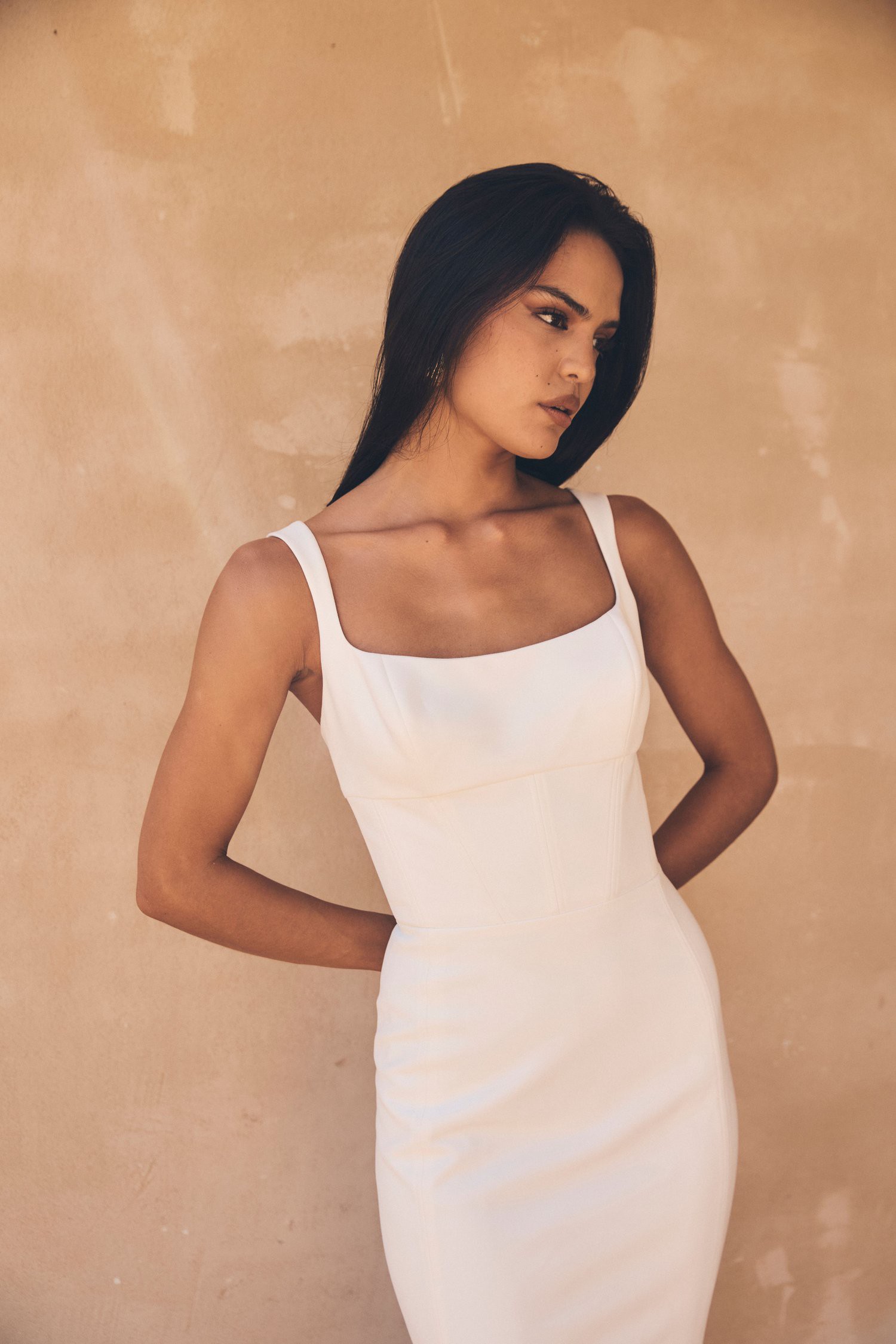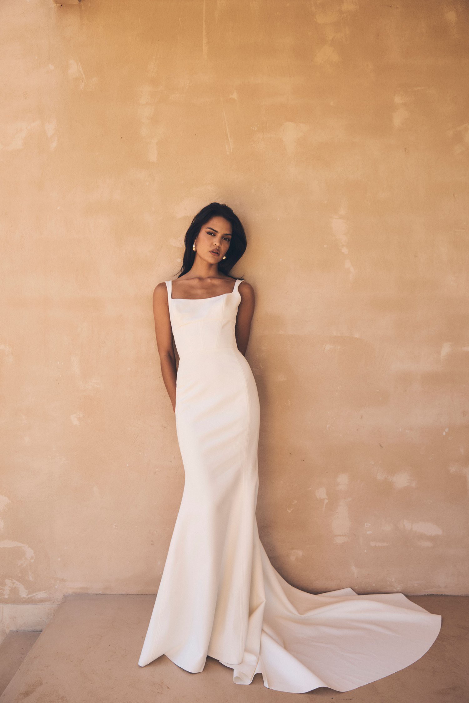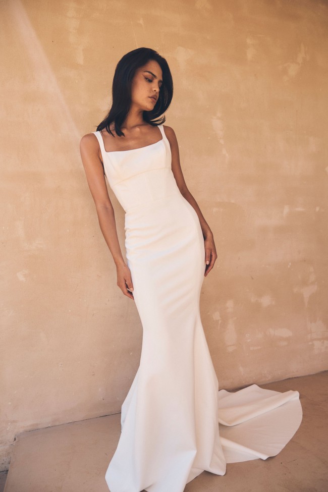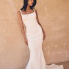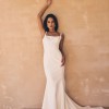 Lawson gown by Jane Hill, beautiful crepe scooped square neckline gown with fitted flare skirt for extra drama.