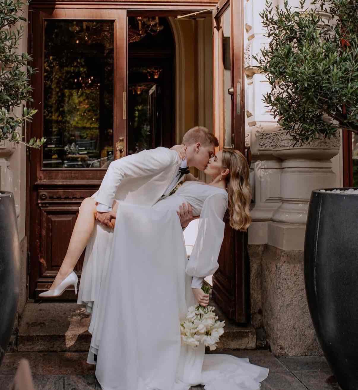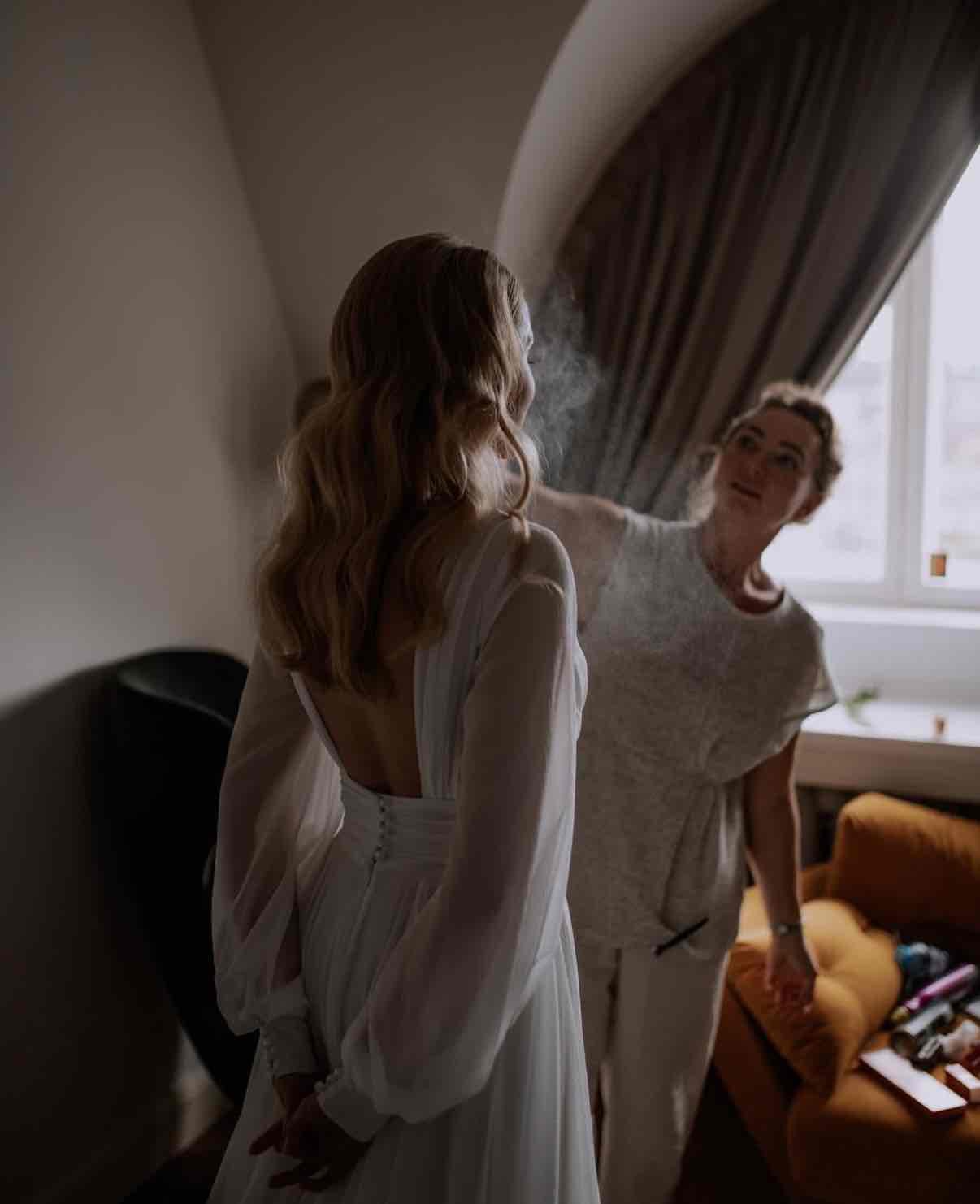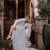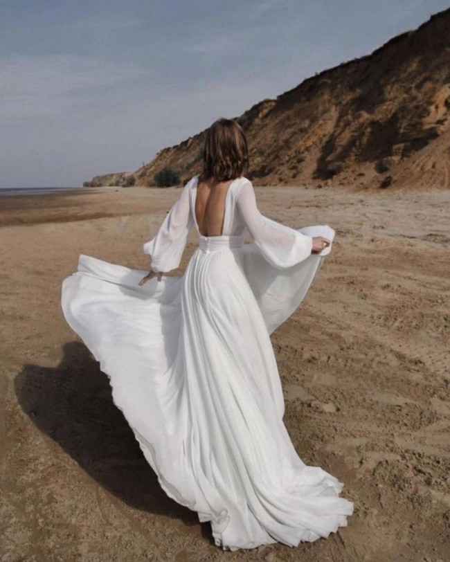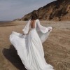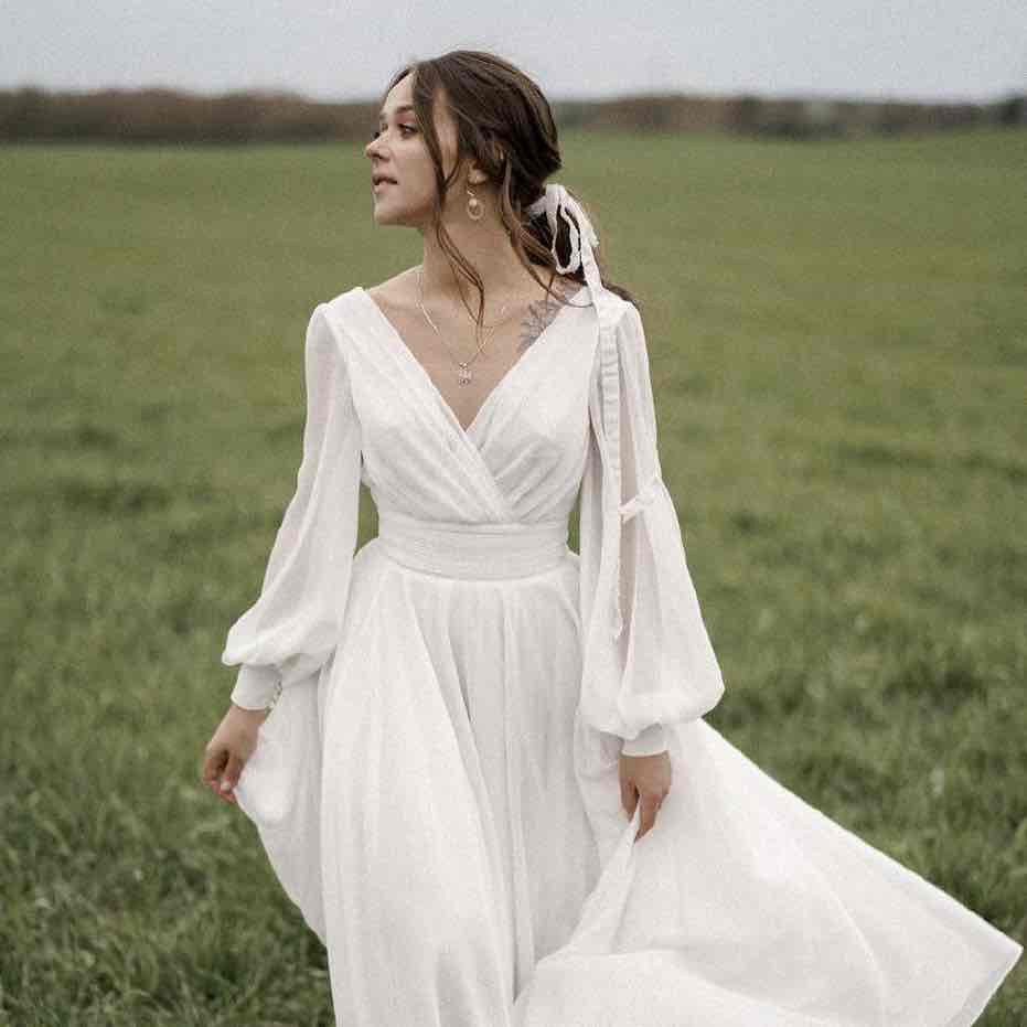 The Paulina Maxi is a stunning wedding dress crafted from soft chiffon fabric, exuding an airy and romantic feel. This A-line gown features a flattering V-neckline, a cinched waist for a timeless silhouette, and long voluminous sleeves that add a touch of elegance. Skirt has a slit. The dress flows effortlessly into a graceful long train. Its delicate and minimalistic design ensures a truly ethereal bridal look.