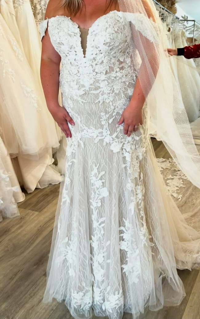 Floor-length in design, this dress flows beautifully, offering an air of sophistication as it glides with every step. Ideal for a grand celebration or an intimate gathering, this size 24 wedding dress combines comfort with unparalleled beauty, making it a perfect choice for the bride who wants to shine on her unforgettable day.