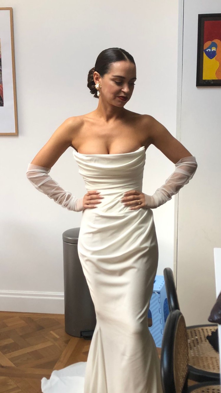 The bodice is boned, so it cinches you in at the waist and accentuates the bust.