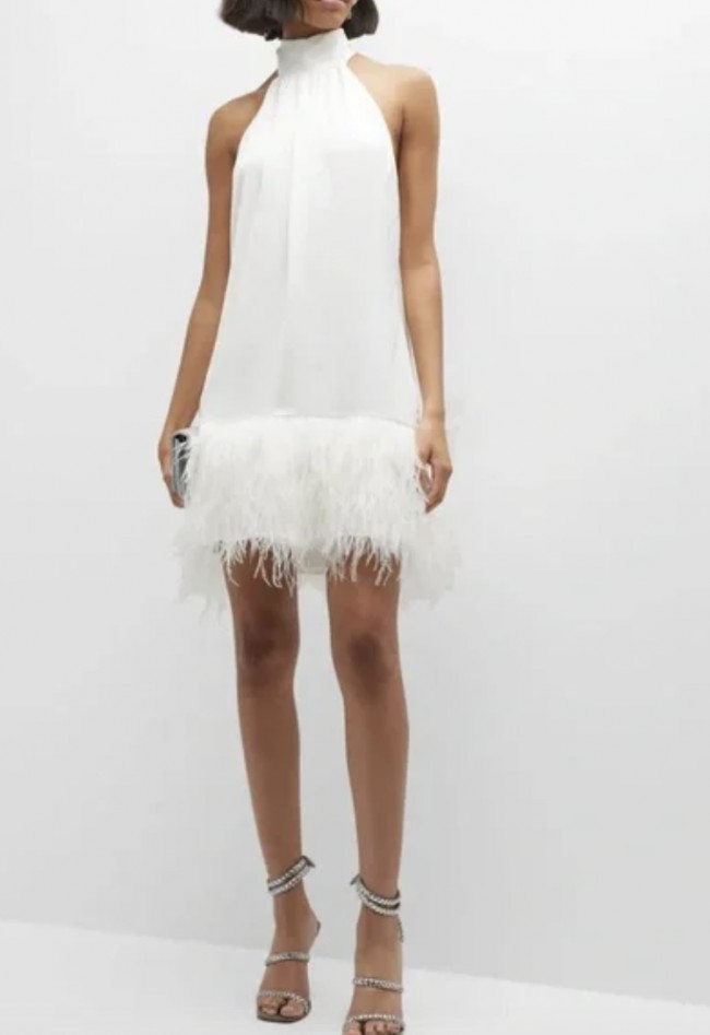 I loved wearing this dress for my after party but it would also be perfect for a bachelorette! It made me feel sexy with the backless design and the feathers at the bottom. Chic and sophisticated while also being fun and flirty. Lightweight, non stretchy material. Dry cleaned, no wear or tear.