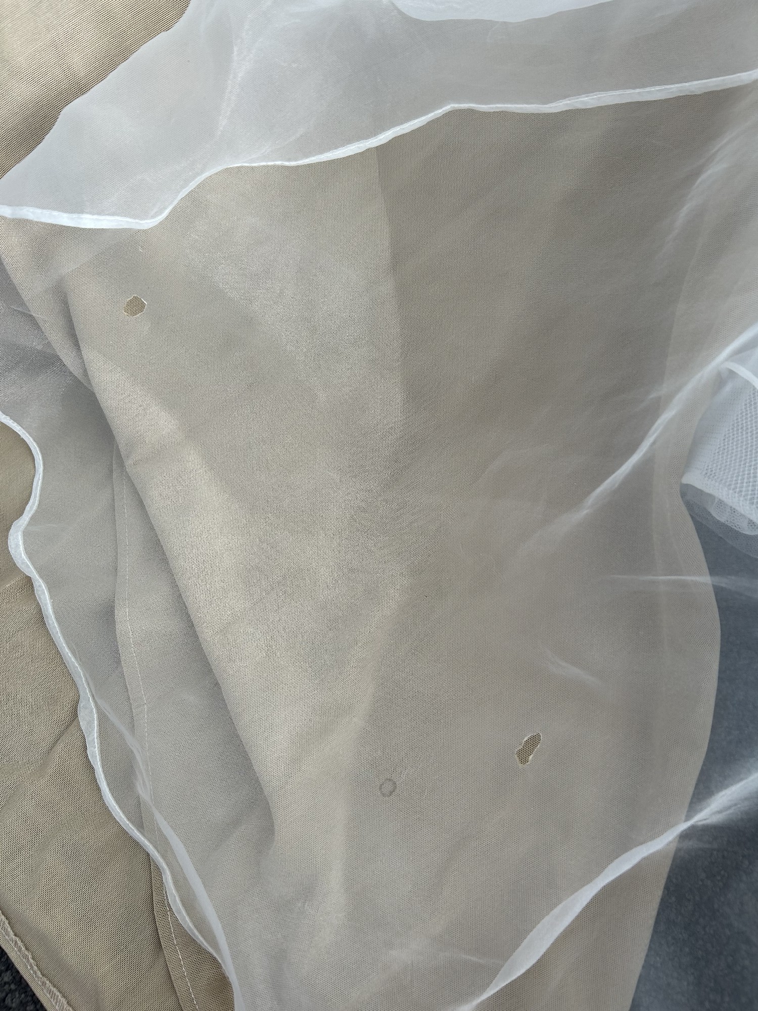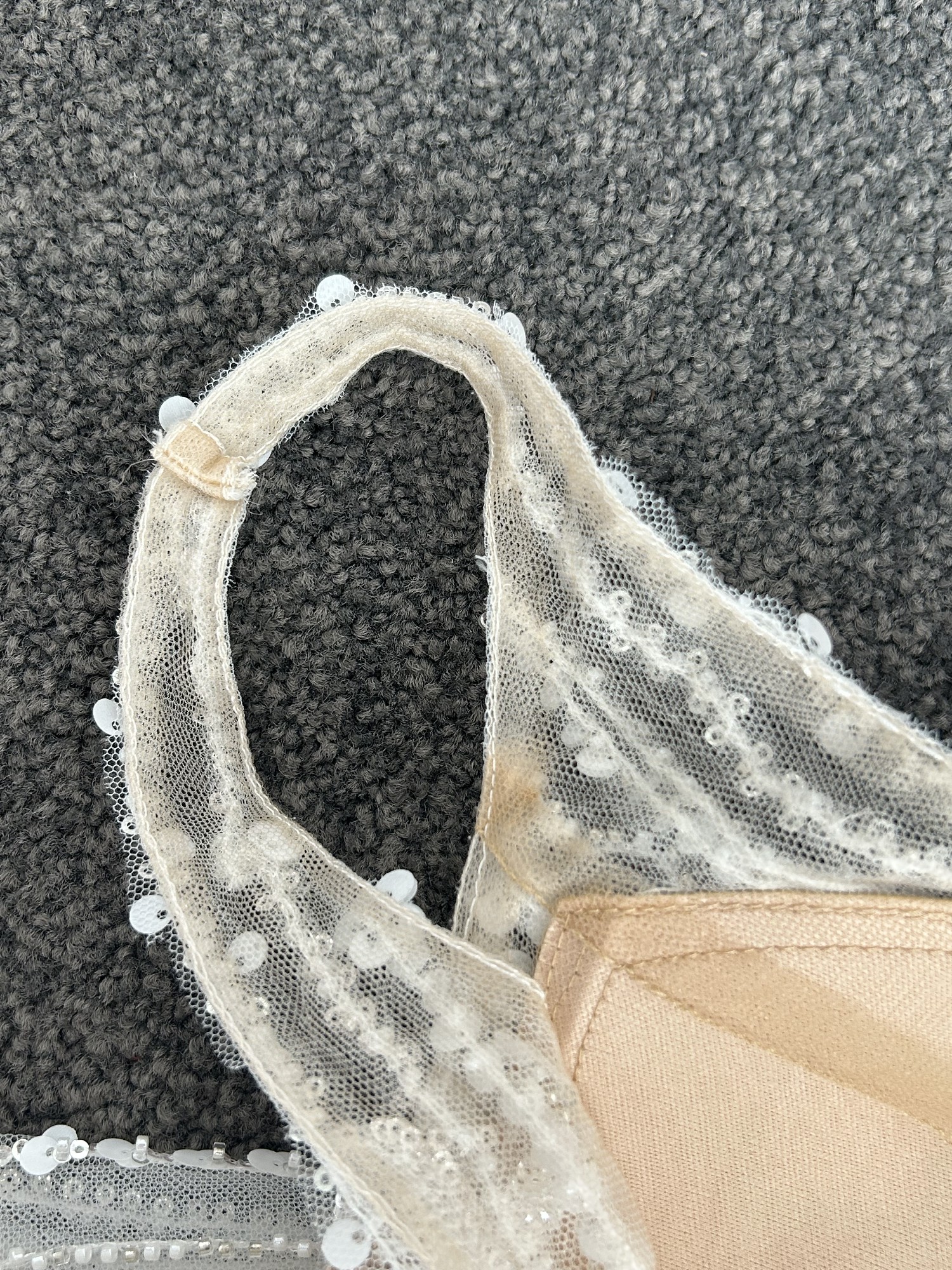 Slight tan stains on inner bra strap pictured and small burn holes in underlay of dress also pictured. Not visible when the dress is on.