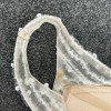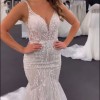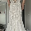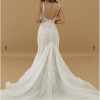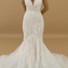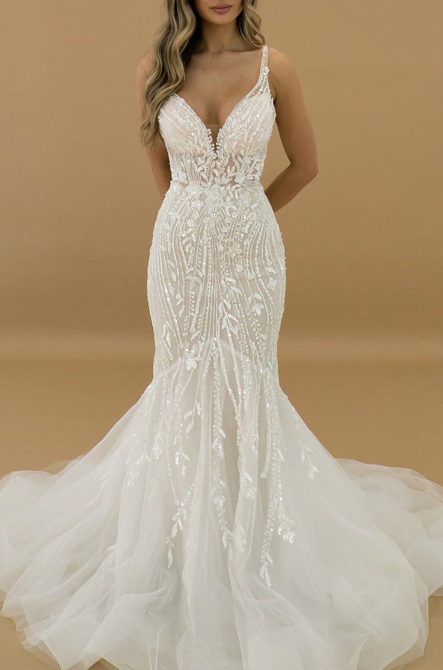 This is a stunning beaded wedding dress featuring a low back, a tulle mermaid style skirt and a plunging neckline. The style is pretty similar to Pallas Couture without the high price tag.