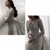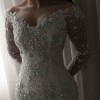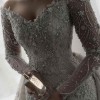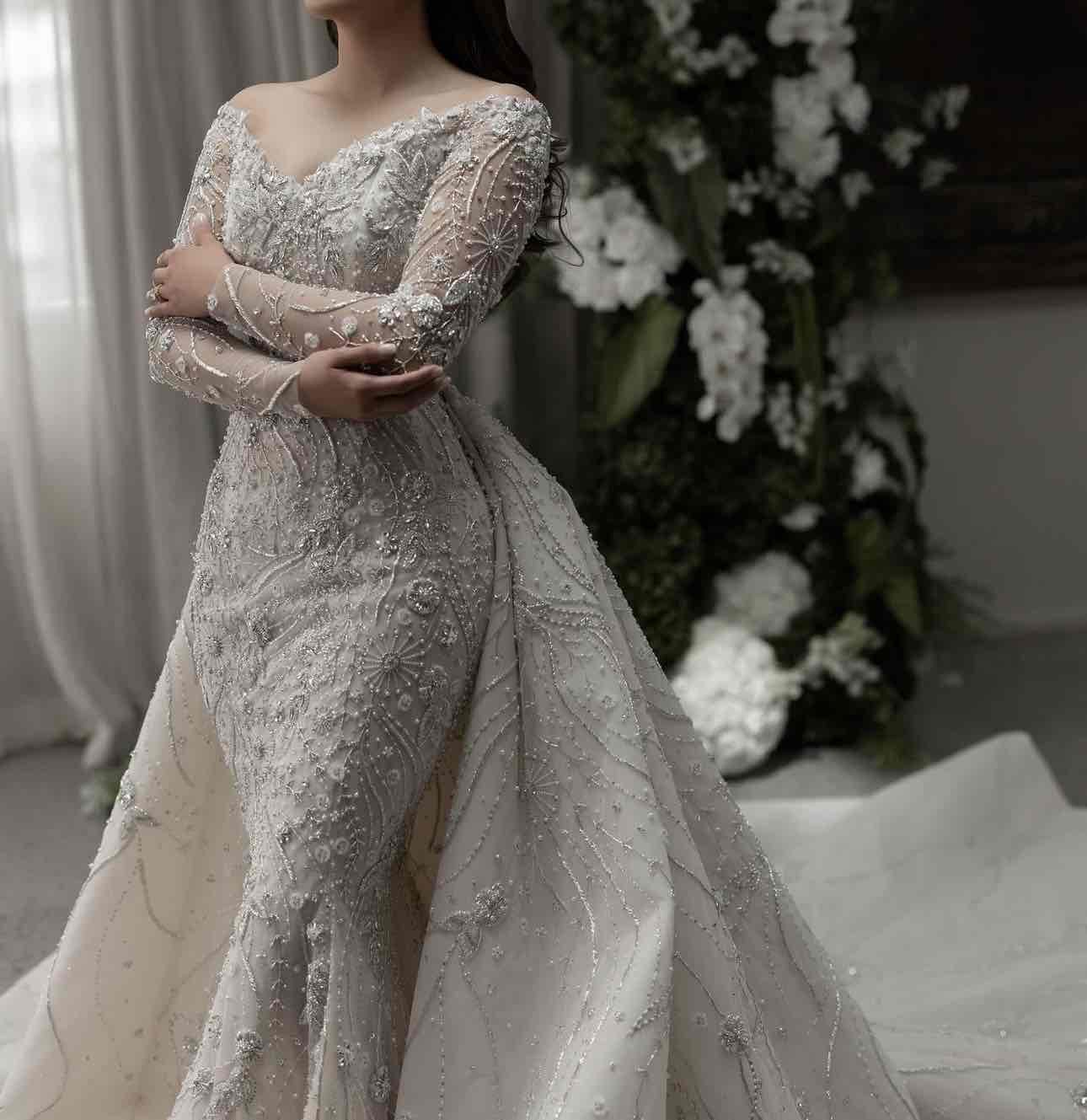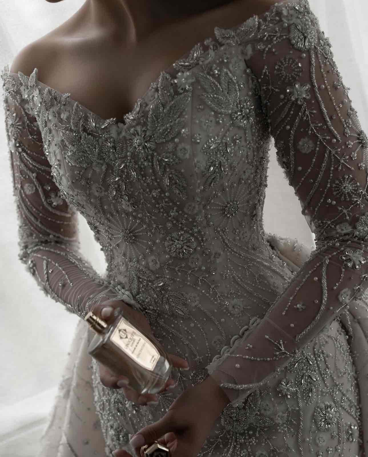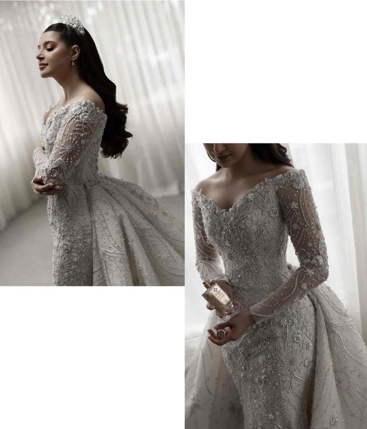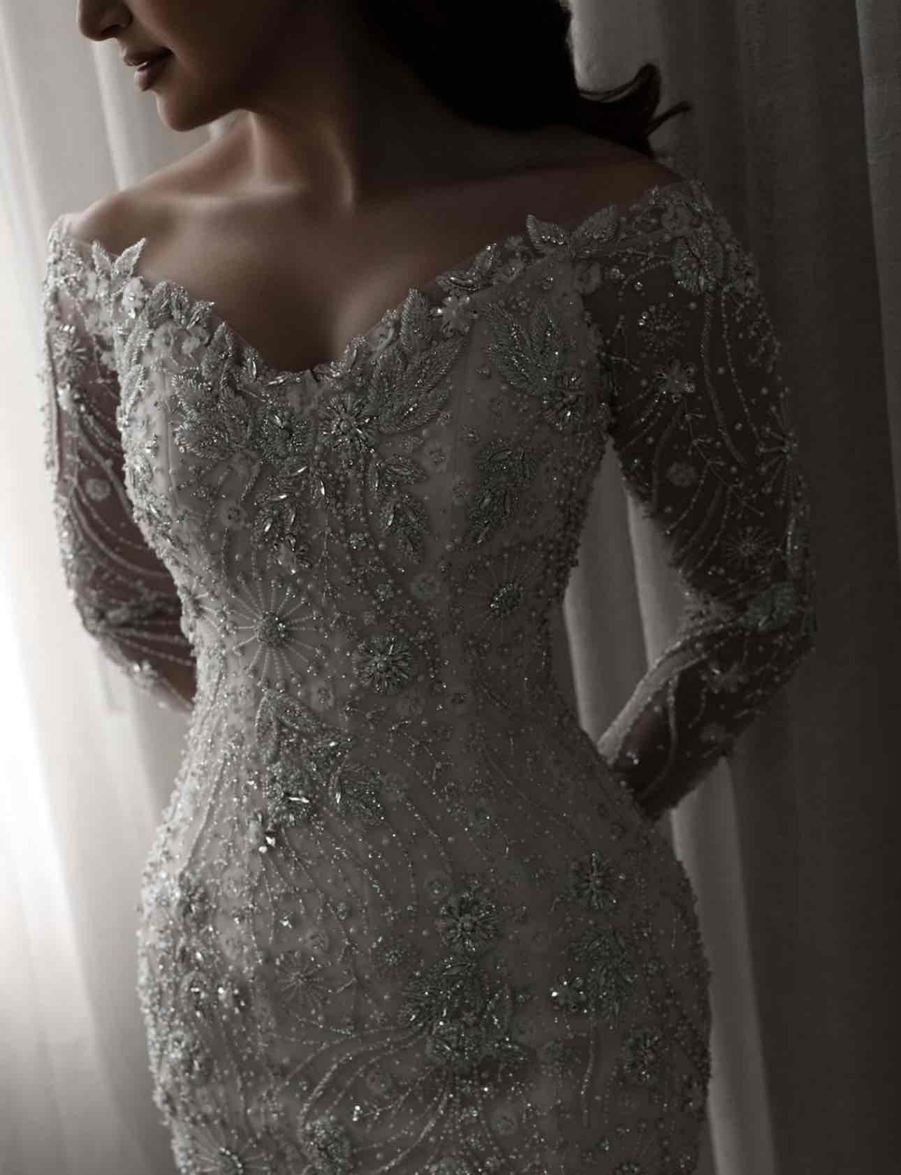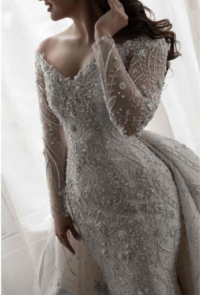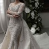 Fully detailed fitted dress with a detailed detachable skirt Built in corset Buttons on back and sleeve Swarovski crystals and pearls