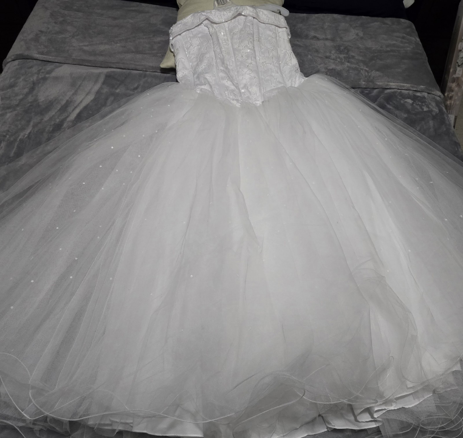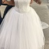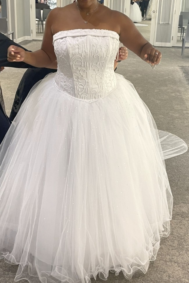 Beautiful, brand new, never worn/never altered, white strapless ballgown wedding dress. Stunning detailed satin bodice, zippered back, fitted waist with princess-like flowing tulle skirt and a long, delicately shimmered train. Still in David's Bridal gown bag as purchased -- seeking a new loving owner.