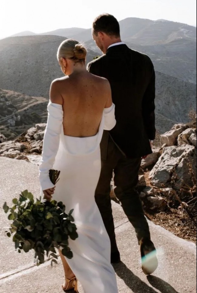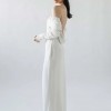 Immaculate ex-studio sample of BB:05 by Bon Bridé. An unmistakable favourite, it is adored for its draped silhouette and sweeping low back. It’s been lovingly handcrafted from a sumptuous crepe that’s subtly off-set with a tonal tape belt. Falling into gorgeous drapes, the bodice is lined throughout and has been fitted with invisible zips to the cuffs so you can roll back the sleeves.