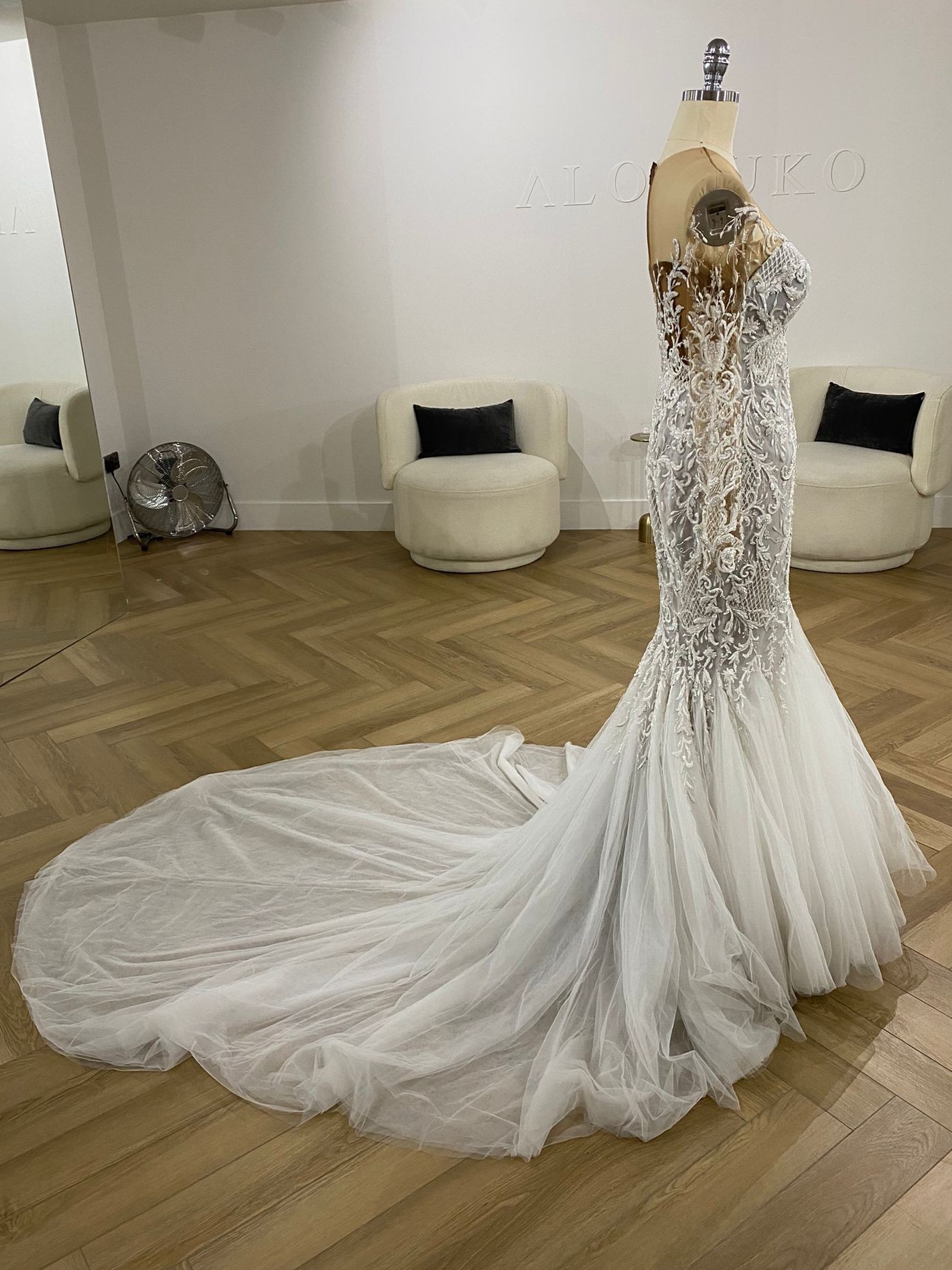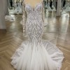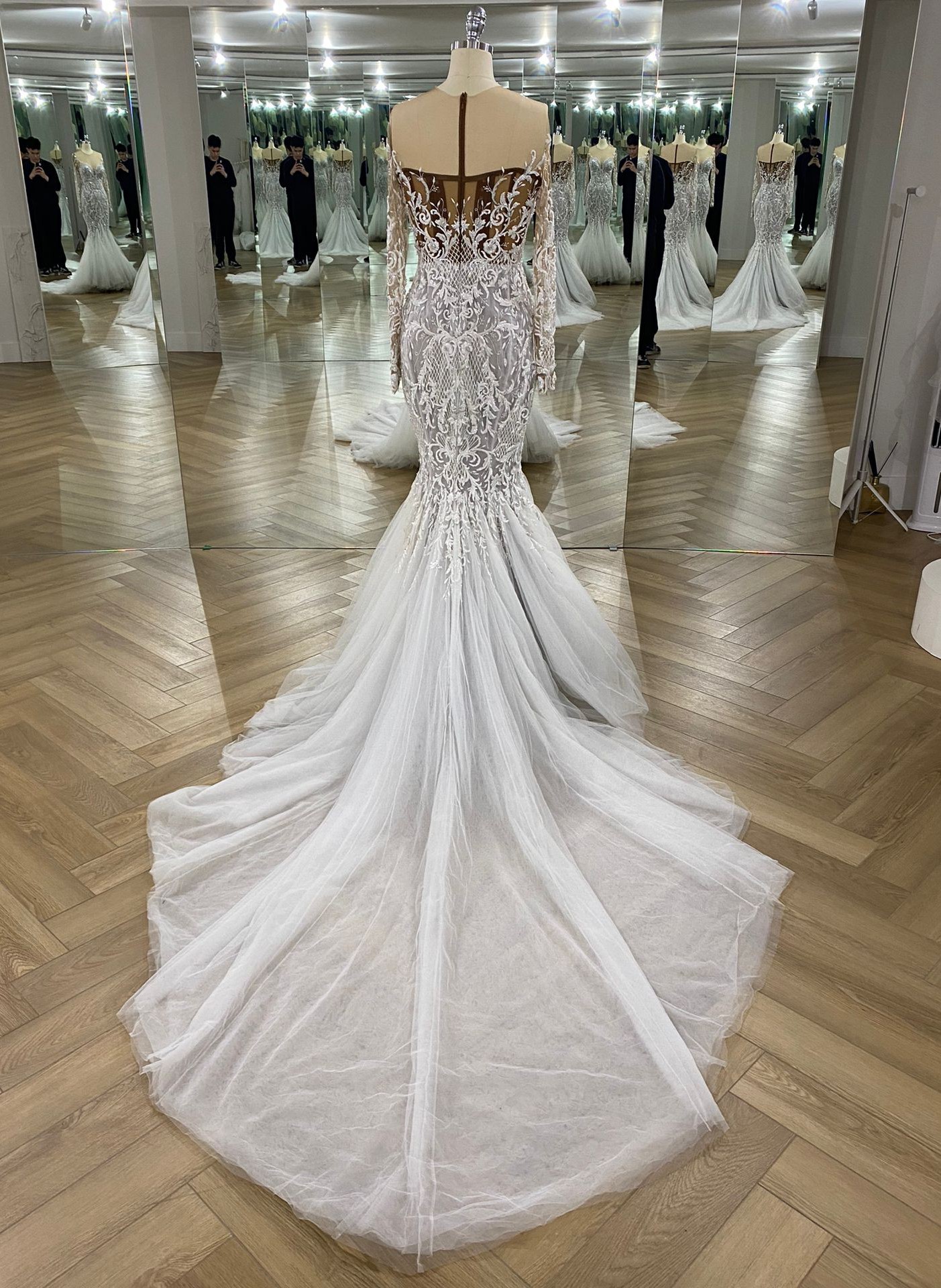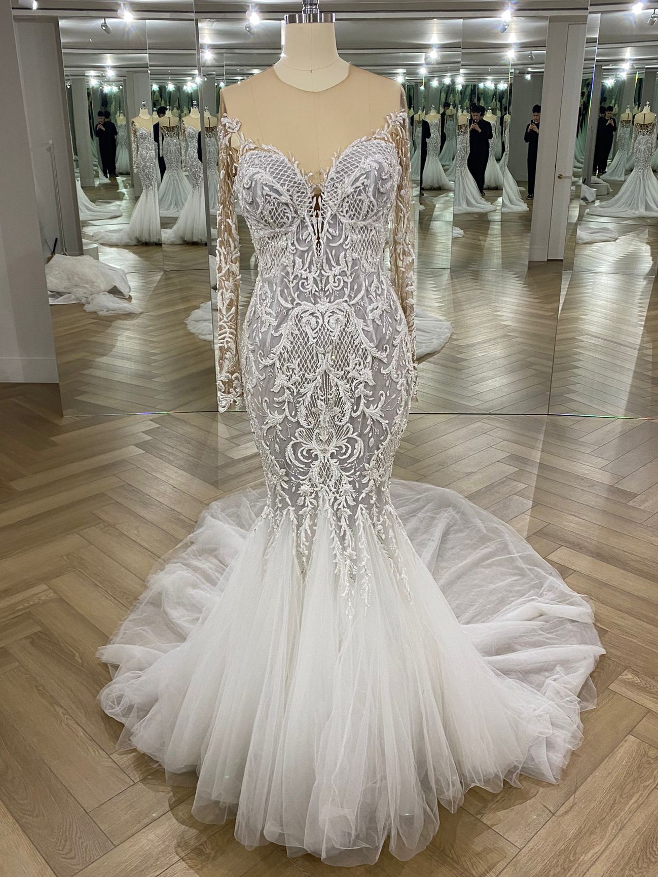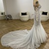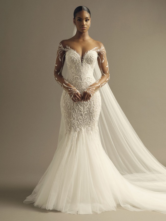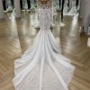 Demonstrating a hybrid of sexy and sophistication. This hand embroidered body hugging fishtail gown speaks to all things feminine, fierce and flawless. Completed with our iconic illusion tulle on the neckline and sleeves, embellished with hand embroidered crystal beads.