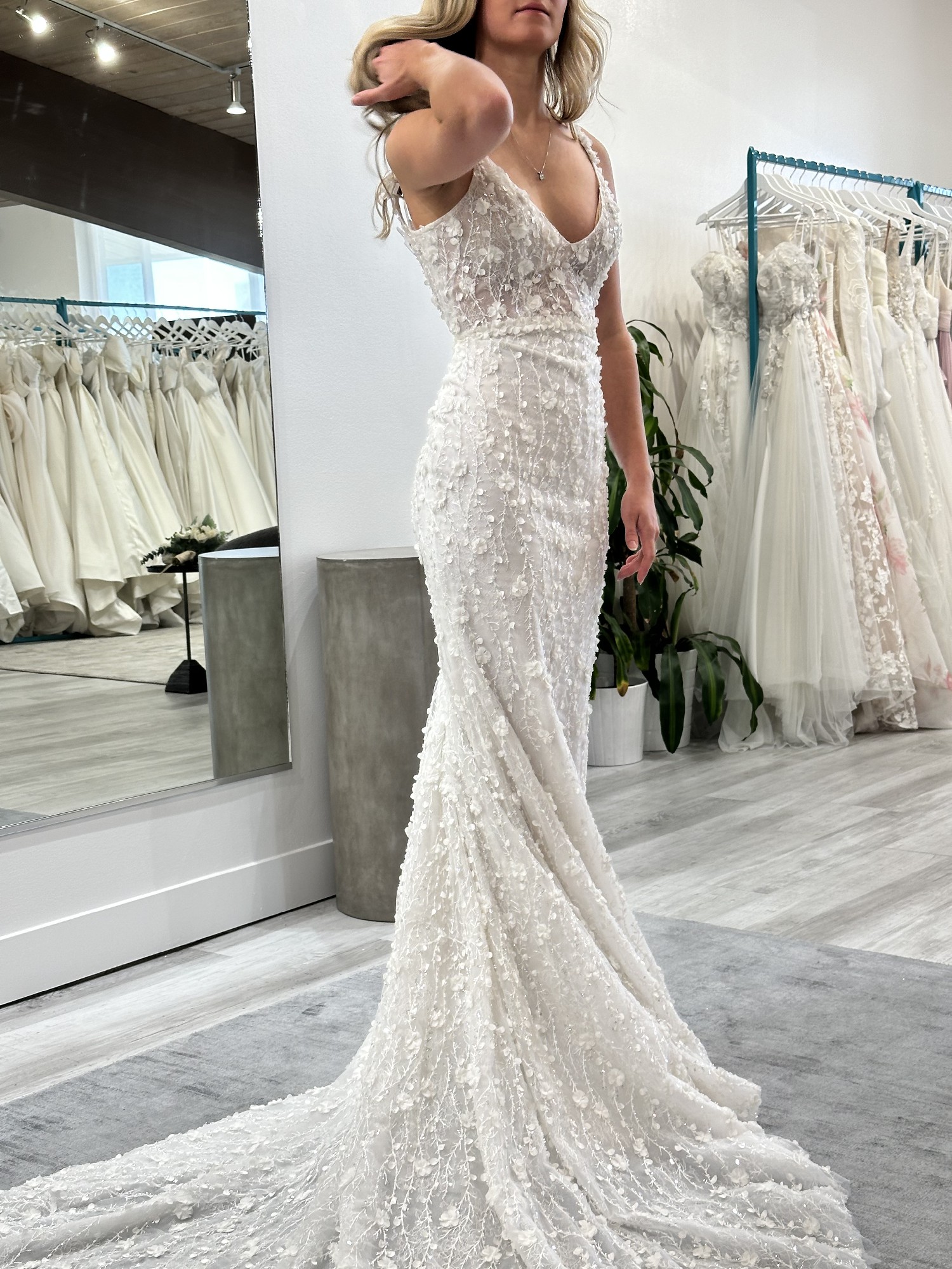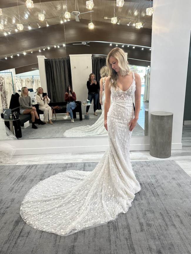 I fell in love with this gown, but I ultimately chose a short dress for my elopement, so I never got the chance to wear it. It’s in perfect condition and waiting for the right bride to make it shine!