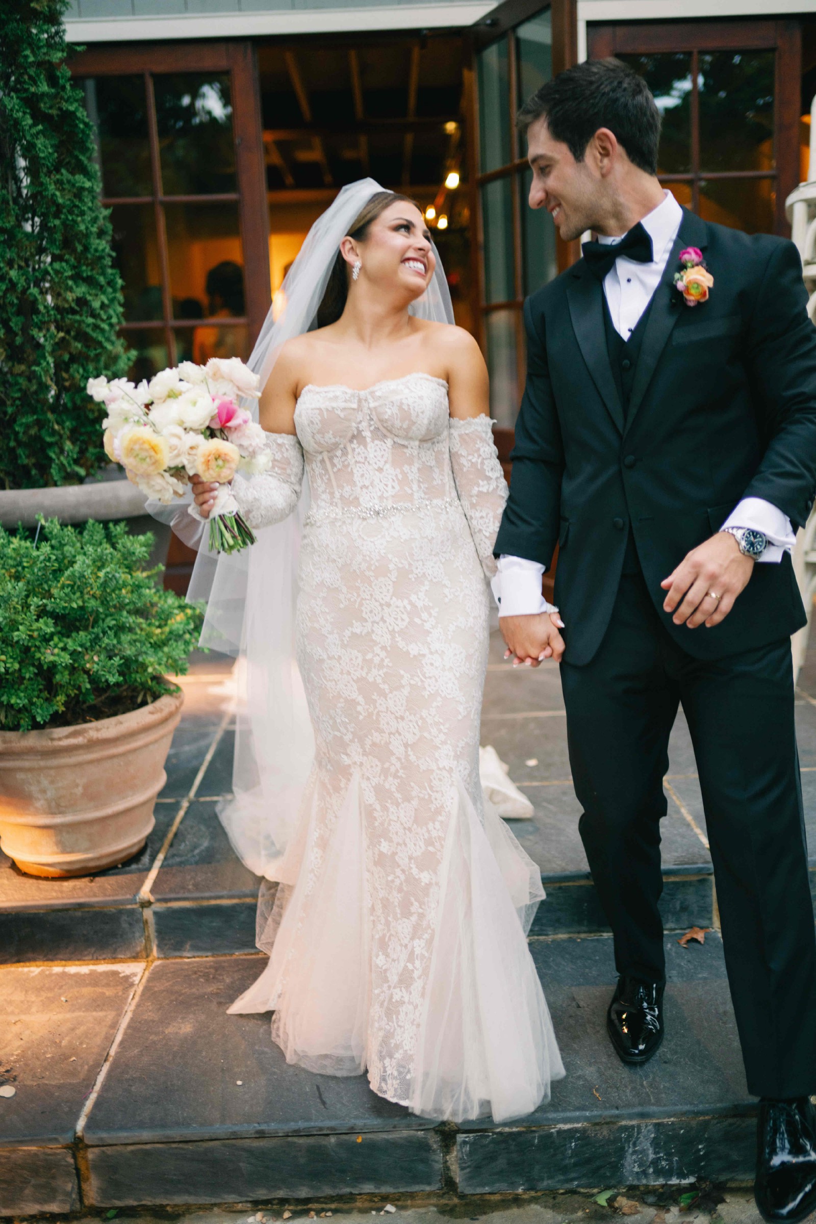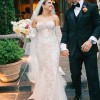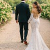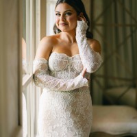 "Berta's 22 - P107 wedding gown is perfect for brides who want a balance between sultry, sweet, and feminine on their big day. The slinky fit and flare silhouette pairs perfectly with the romantic soft lace and semi-sheer nude underlay that continues all the way through the train. Brides will love the flattering corset boning and waist-defining beading on the front of the gown. The back of the gown is equally as stunning with exposed corset boning and a flirty bow detail for a sexy yet sweet open back look." Dress was professionally dry cleaned and preserved in a box. Dress also includes a cathedral viel with blusher that was purchased from Etsy if you are interested. **Detachable sleeves are not included.