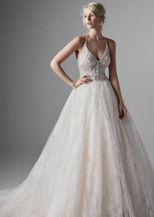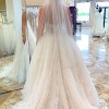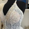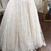 The true definition of STUNNING, this breathtaking ballgown boasts elegance from every angle. It features a delicately beaded deep halter V-neckline, intricately beaded embroidered illusion bodice (which includes small opal stones), and a gorgeous ivory over blush Chantilly laced full skirt adorned with beaded lace motifs and pewter accents finished in horsehair hem.