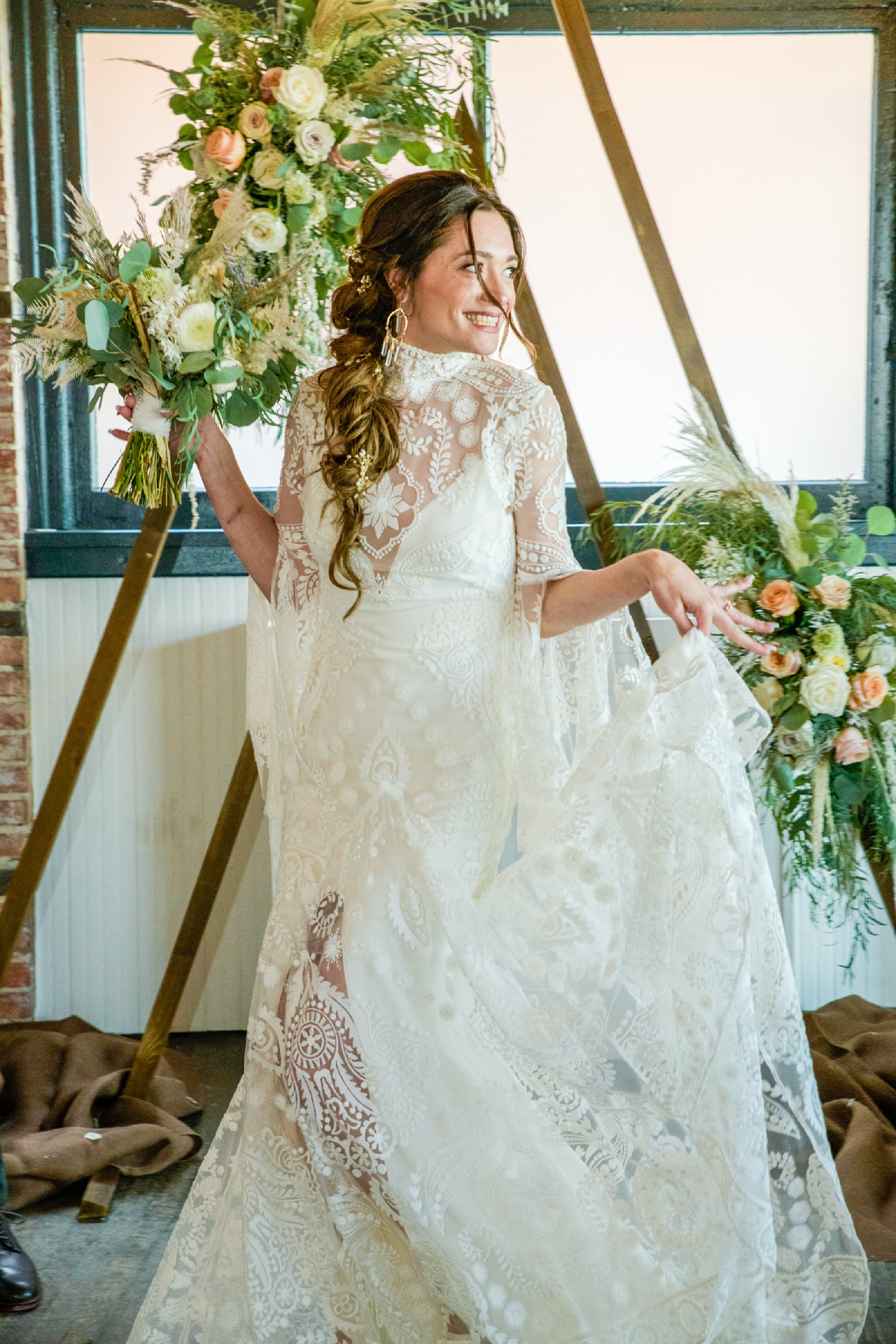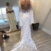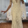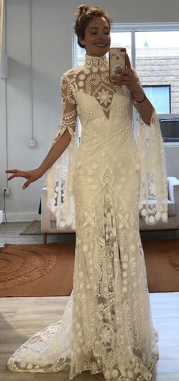 Gorgeous boho dress. (Consists of a slip and lace over dress) was Altered to take in a bit at waist and hip to match my measurements. I am broad shouldered but relatively flat chested so no alterations were made in the bust. I am a size 6 US. We sized up to 8 US (12 UK) to accommodate my shoulders. Post wedding we paid a lot to have Dress professionally cleaned and preserved, and sealed to prevent discoloration. She is in excellent condition and ready to be another bride’s dream dress!
