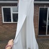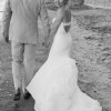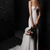 Crepe column gown with a structured bustier bodice and plunge back. A cascading bustle of soft ivory organza and tulle contrasts with the clean lines of the skirt.