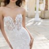 Crafted from delicate ivory lace, this dress has a timeless quality that stands out while blending beautifully into any wedding theme. The strapless design allows you to showcase your shoulders, making it an ideal choice for a summer wedding or a chic indoor ceremony. The mid-back design adds a hint of sophistication while maintaining an air of modernity.
