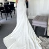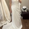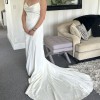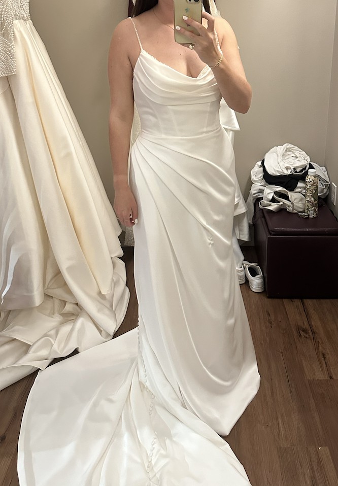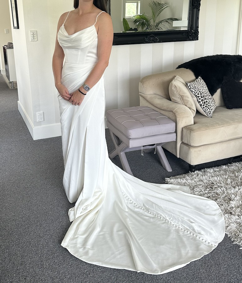 Charmeuse fit and flare gown with a cowl neckline embellished with pearls that continue up to create spaghetti straps. Bodice detailed with couture seaming and is met with a ruched skirt with a slit. Complete with charmeuse covered buttons cascading to end of chapel length train.