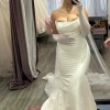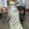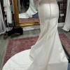 strapless stretch Mikado fit and flare with stylized straight neckline accented with draping across bodice. The dress features Mikado covered buttons extending to end of chapel length train
