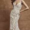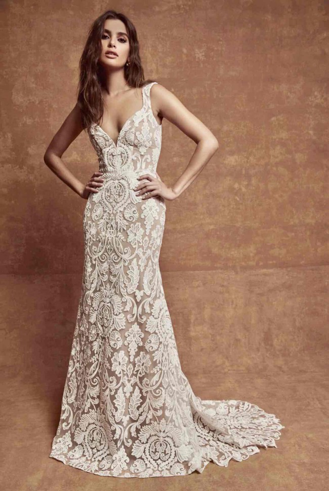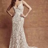 Sarah Seven Milan is an elegant embroidered lace fit and flare gown. V neckline, curve straps, and a scalloped h train. Light ivory in color with underlay. Never worn. Absolutely beautiful but we changed our mind on venue and this was too much. Original price $3000