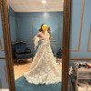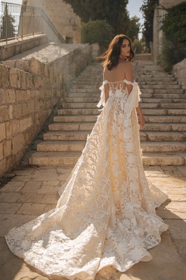 Sample dress in GREAT condition. This gown is absolutely stunning and comes with no alterations. 3D lace flowers and satin off the shoulder bow straps are shown in this dress. Make a statement with Berta 22-108! Dress is a US size 12 or EUR size 44. Please message me if you have any questions!