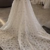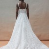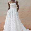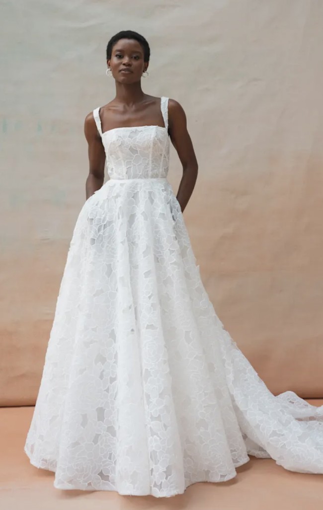 Intricately textured cut out floral organza fabric is cut into clean lines with a dramatic silhouette for the strikingly romantic Charlie gown. Slightly tapered straps and a straight neckline create a sharp square neckline supported by a sculpted corset. The circle cut ball skirt is left semi sheer for a lighter than air feel.