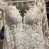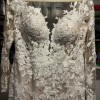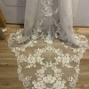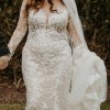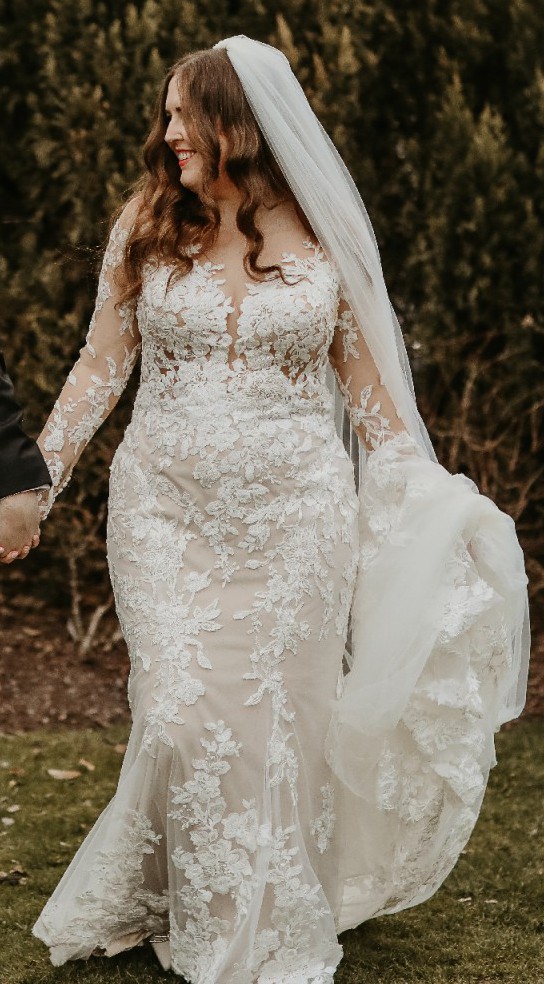 Style D3284 from Essense of Australia is a blend of floral bridal design and ultra-modern fashion. A sheer bodice starts the look off with a bold statement, creating a semi-off-the-shoulder illusion with nude tulle and floating tattoo laces--thoughtfully dispersed throughout the bust and waist for tasteful and flattering coverage. These floating laces continue the tattoo-like effect over the long sleeves, with an organic finish on the cuff for a hint of classic nostalgia. A slight shimmer throughout the fit-and-flare design echoes modern luxury and just a touch of drama, without overwhelming the look. The wide open back is also edged with floating lace details for a fresh, fierce look. Finally, the extra-long scalloped train perfects your bridal moment with incredible organic lace finishing.