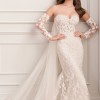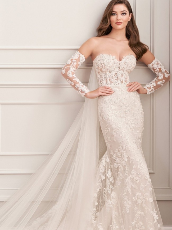 The captivating mid-back design enhances your stunning look while detachable sleeves offer versatility, allowing you to customize your style—from a romantic, ethereal feel during the ceremony to a sleek, chic appearance at the reception. The luxurious embroidery elevates this dress to a work of art, creating texture and dimension that will leave your guests in awe.