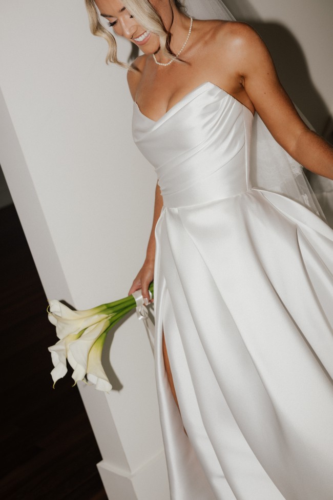 I wore this stunning gown on my special day, and it made me feel like a princess. Being quite short, the altered split and the floor-length skirt flowed gracefully with every step. The silk white photographs beautifully, (being a photographer myself this was something I took into consideration when trying to find my dream gown).
