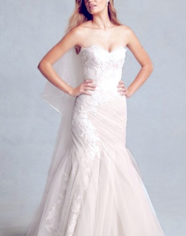 NEVER worn. NEVER Altered. Silk white,“latte” underlay. Matching veil included. Elegant mermaid gown with delicate and beautiful lace details. The elongated mesh lace sweetheart bodice ends where the skirt with appliques begins; fitted to the thigh where the tulle starts (the beading, sequin and lace detail continue on pieces of the tulle) Gorgeous! Extremely comfortable to wear and allows for easy movement. Skirt allows for a bustle if desired.