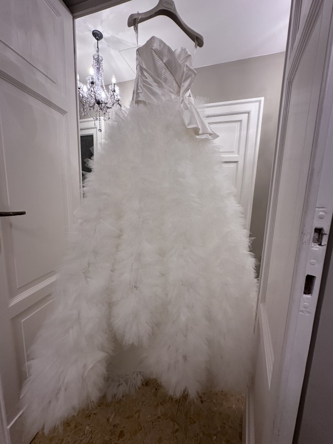 In a classic ivory hue, the Ludovica gown is versatile enough to complement any wedding theme, from opulent ballrooms to intimate garden ceremonies. Perfectly sized at 42, this breathtaking bridal ensemble is ready to make you feel like a princess on your special day. Say "I do" in style with the enchanting beauty of the Ludovica gown.