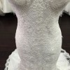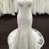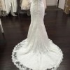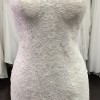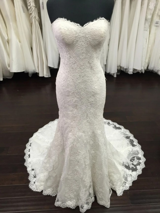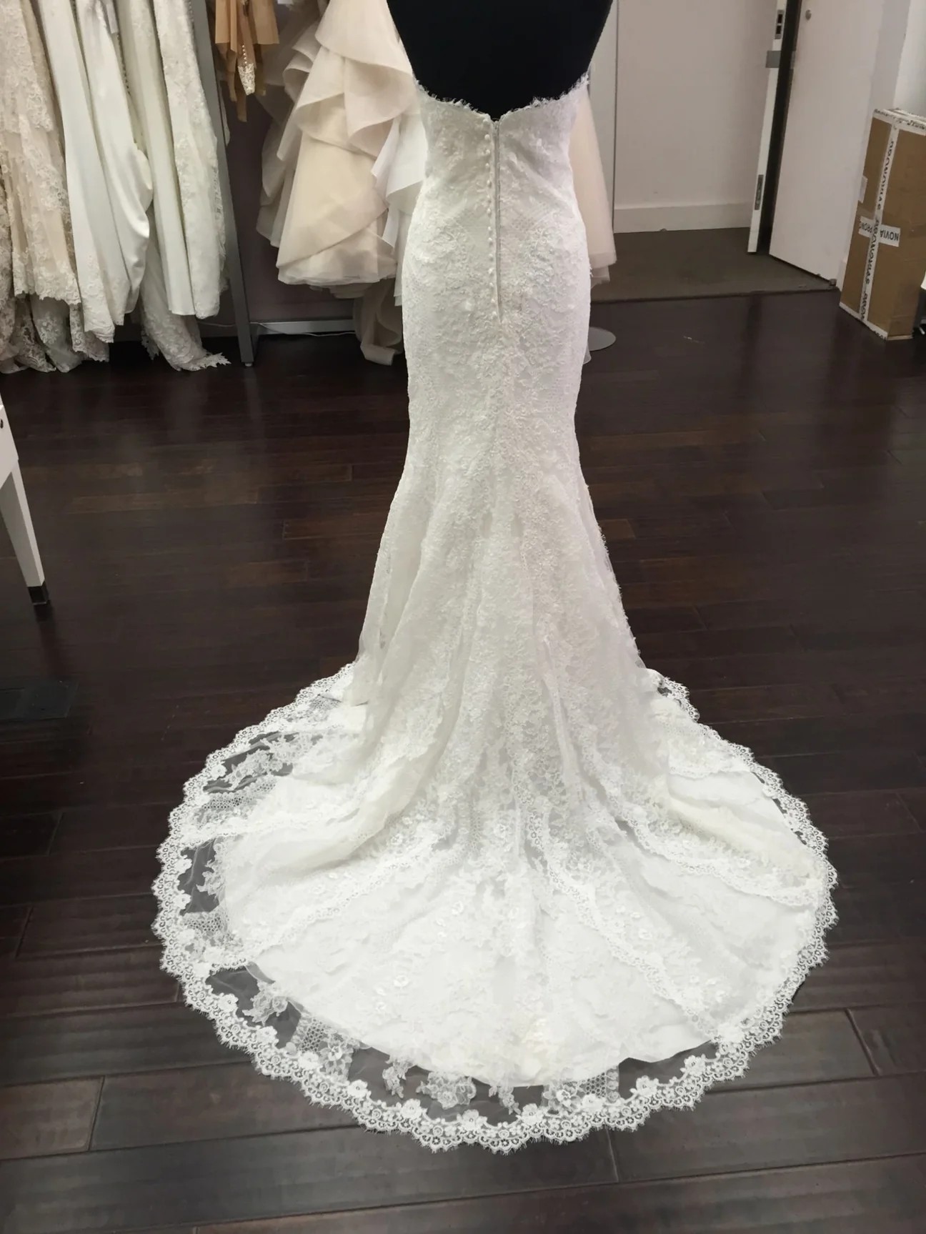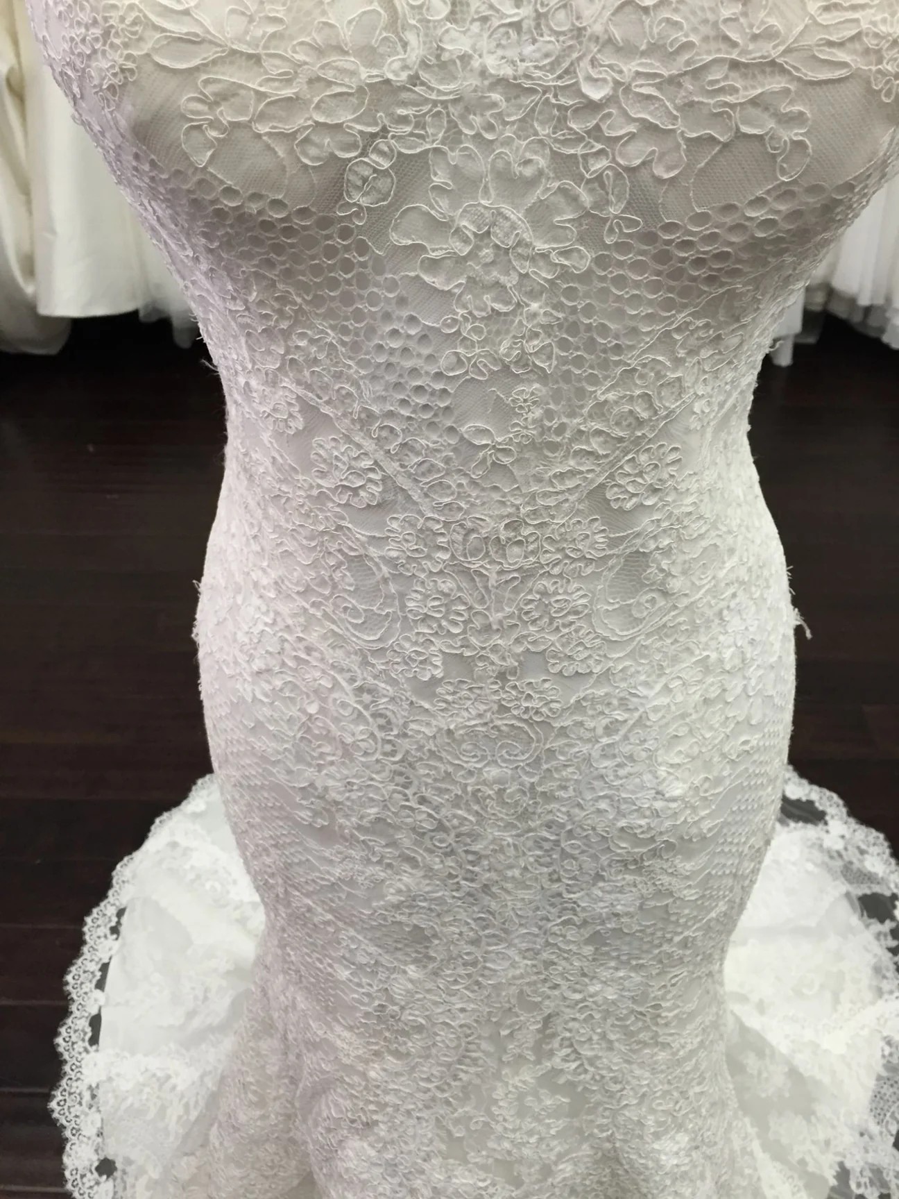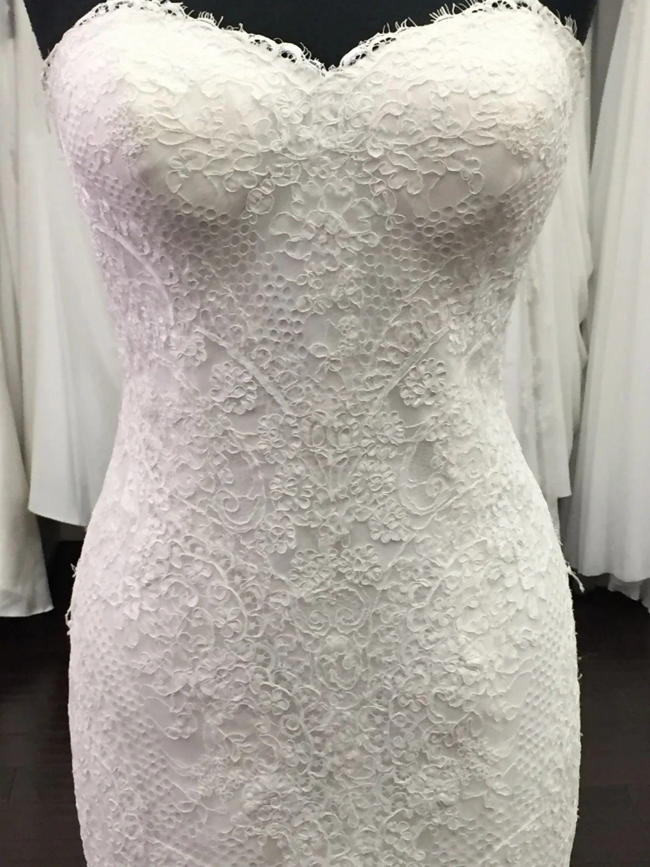 This is a sample dress which has not been worn, but shows signs of trying on. No alterations have been made. The dress is missing the zipper pull, but the zipper works.