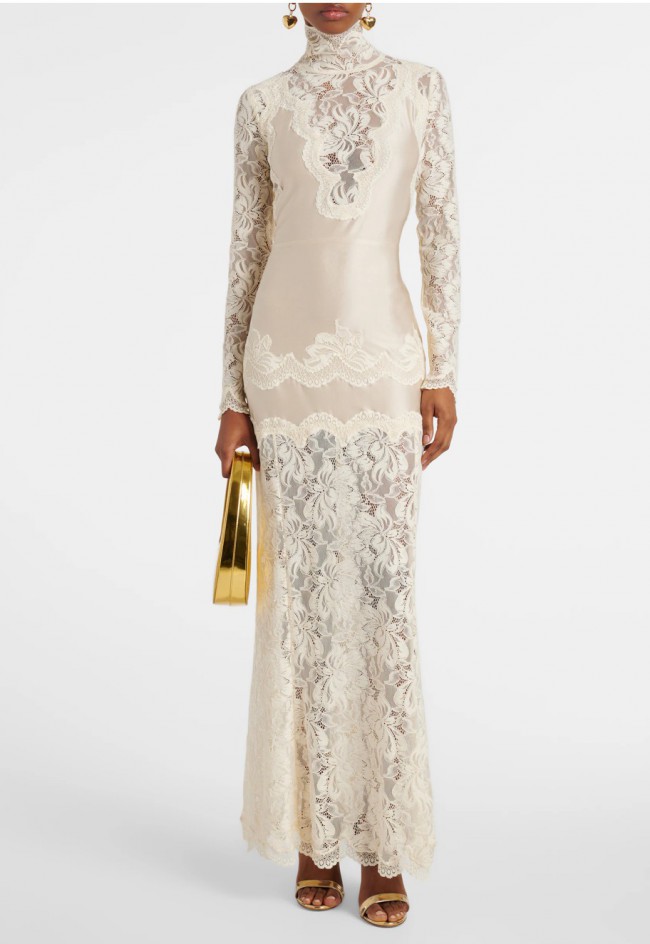 This stunning lace-trimmed silk-satin maxi dress by Rabanne was the centerpiece of my dream wedding. It perfectly combined elegance and modernity, making me feel like a true vision as I walked down the aisle. The high neck and long sleeves create an air of sophistication while the sheath silhouette hugged my figure beautifully, flattering every curve.