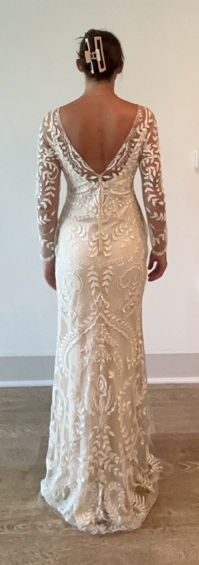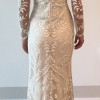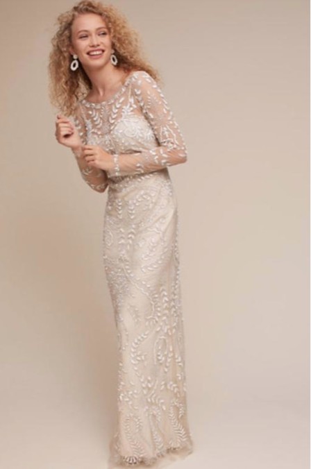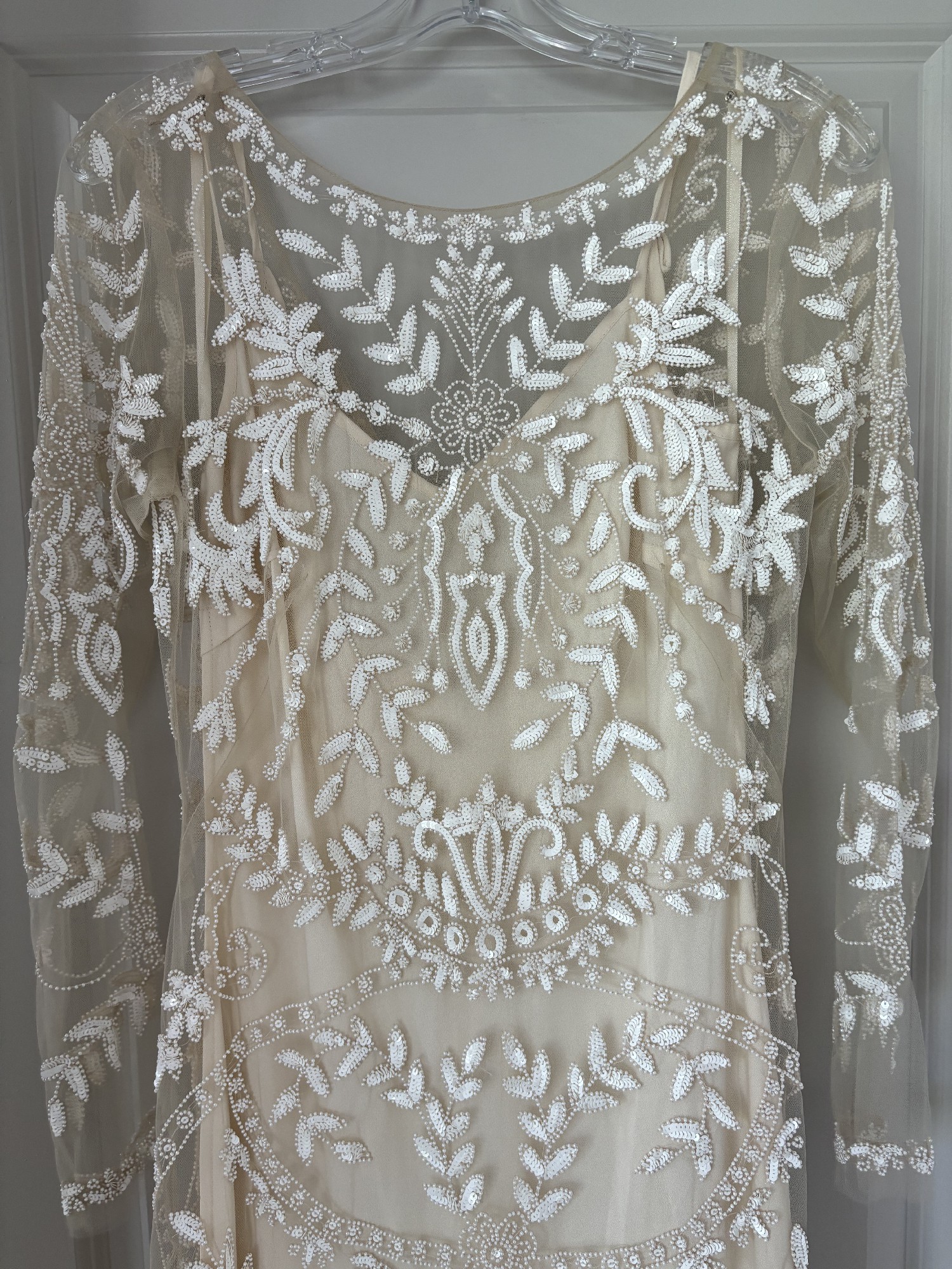 Long sleeves provide an unexpected twist, combining traditional elements with contemporary style. Delicate beading is present all over. There is a tank slip dress under the sheer fabric and beading.