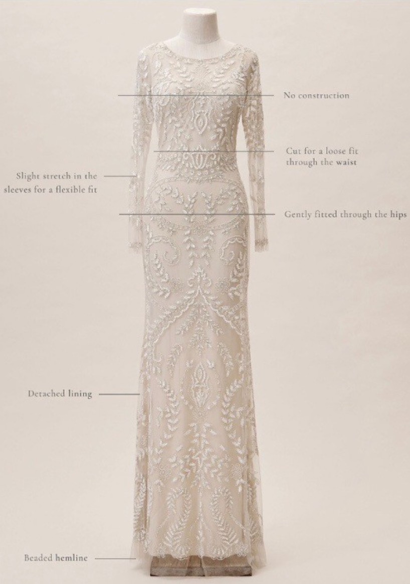 This breathtaking wedding dress from BHLDN captures both elegance and modern sophistication. Crafted in a stunning ivory hue, this sheath silhouette effortlessly hugs the body, creating a striking yet comfortable fit.