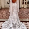 White tassels drape over floral embroidery creating a truly angelic aesthetic. Fitted bodice with crochet trim highlights the waist and compliments the figure. Flattering deep 'V neckline, set in sleeved with opening to show the arm, semi full skirt and generous train.