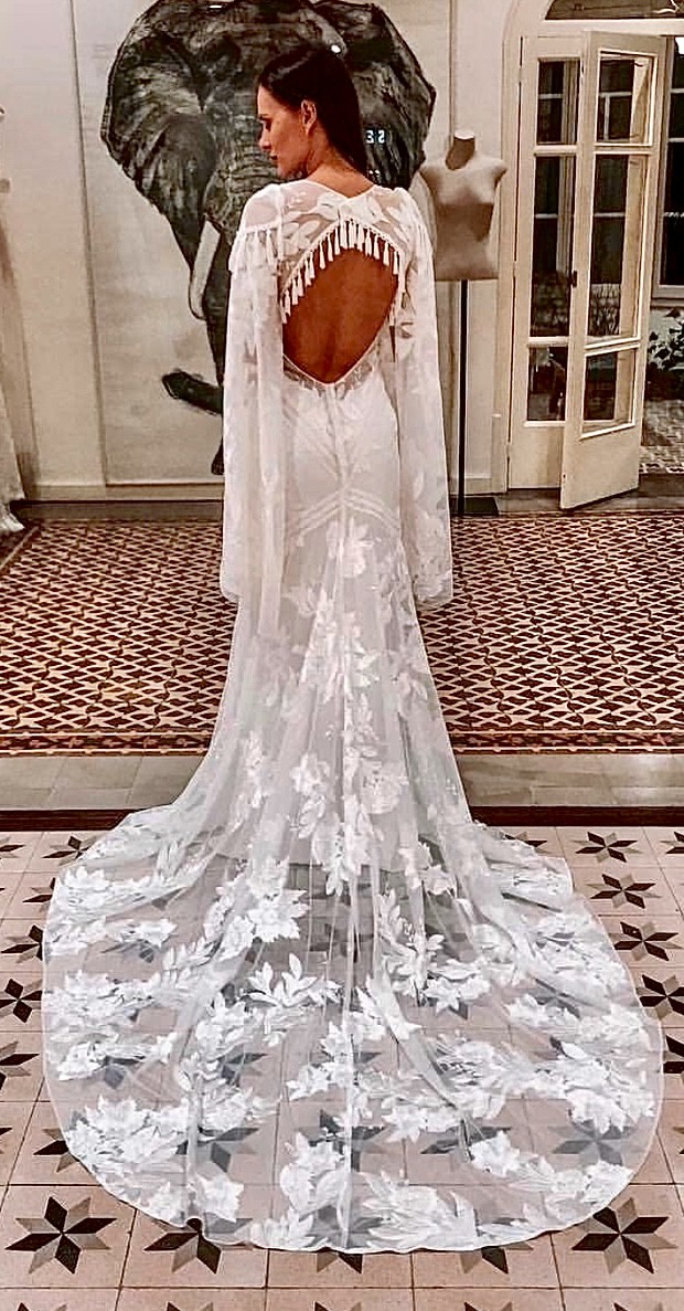 This is an extremely unique Boho dress that is now discontinued by the very popular Australian designer, Rue De Seine Bridal. Aegean is the style name if you wish to look up more images.