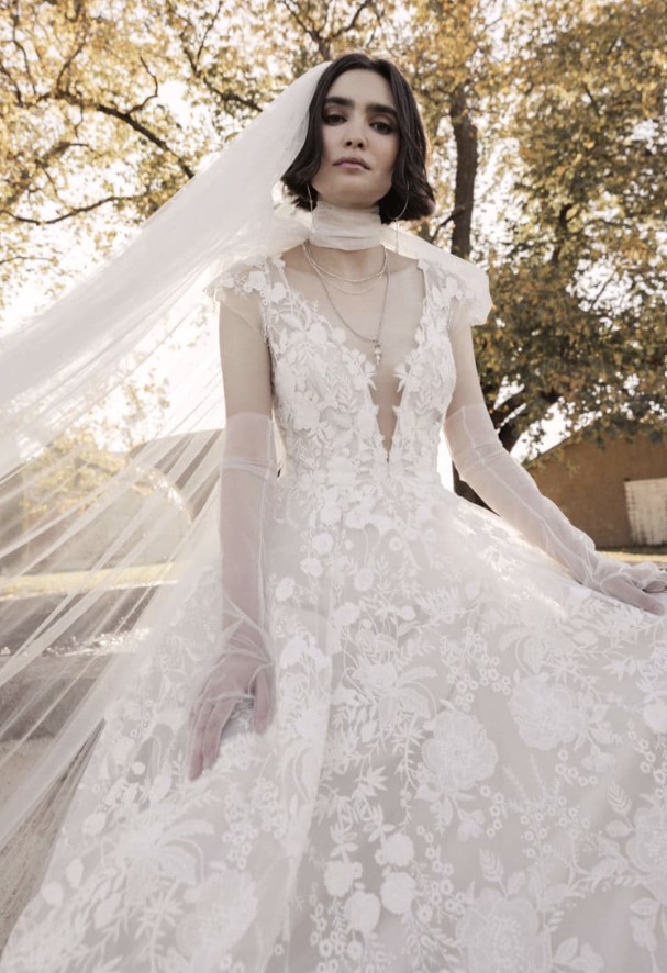 Dripping with three-dimensional flowers and vines, Blake is sure to capture the heart of our brides looking to have an ultra-romantic moment. Blake’s cap sleeve is delicate and sheer for subtle coverage and compliments the twisting and turning vines through the neckline. A true garden fantasy that can transition into any setting.