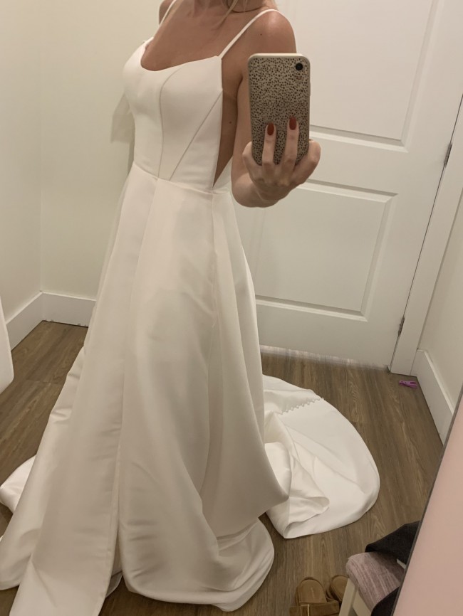Dress is unaltered. Please let me know if you would like additional pics. Dress has only been tried on and stored in garment bag. Changing venue and looking for something different.