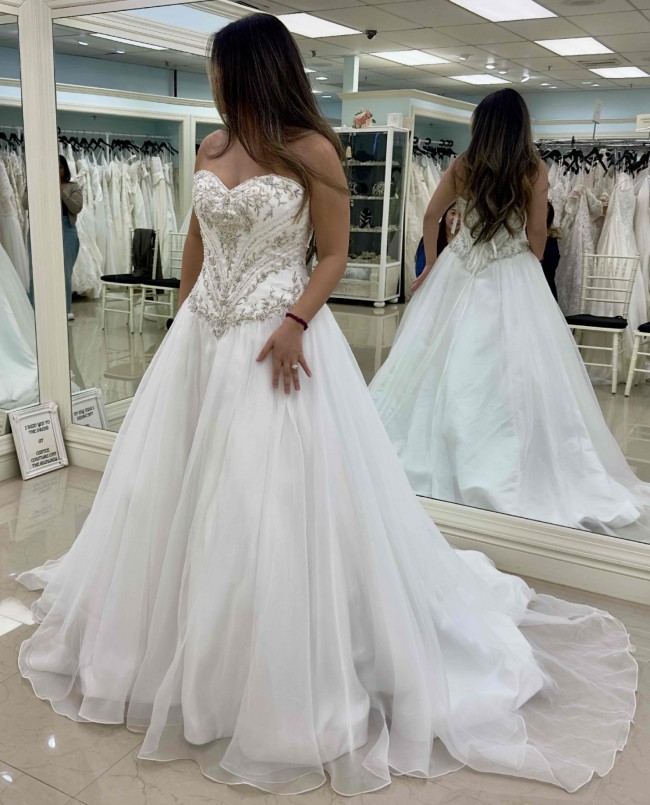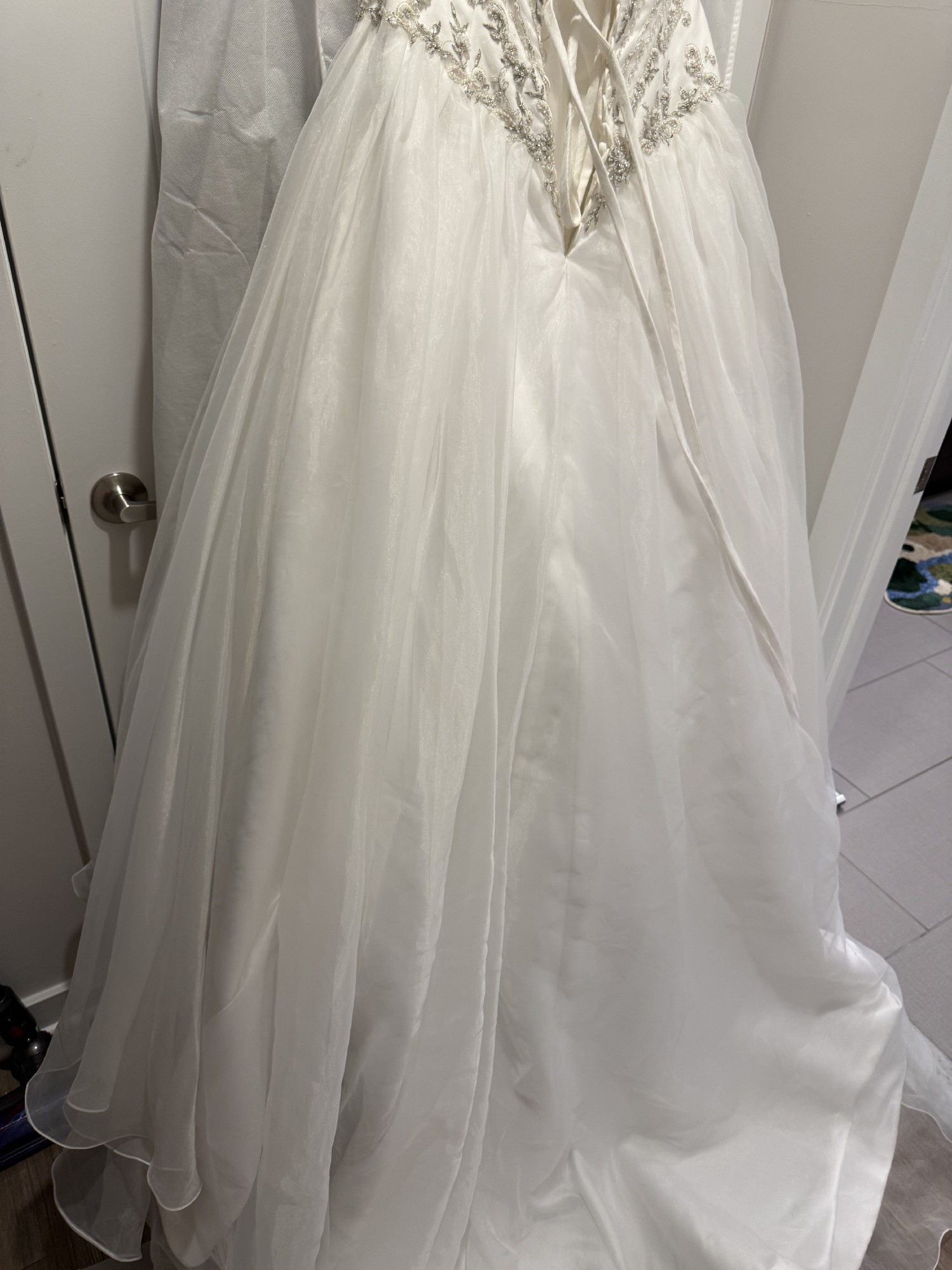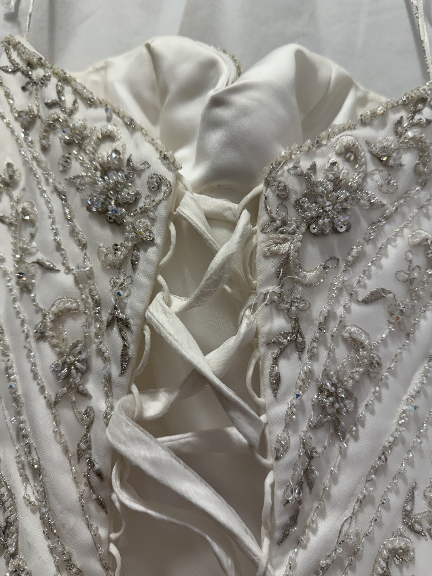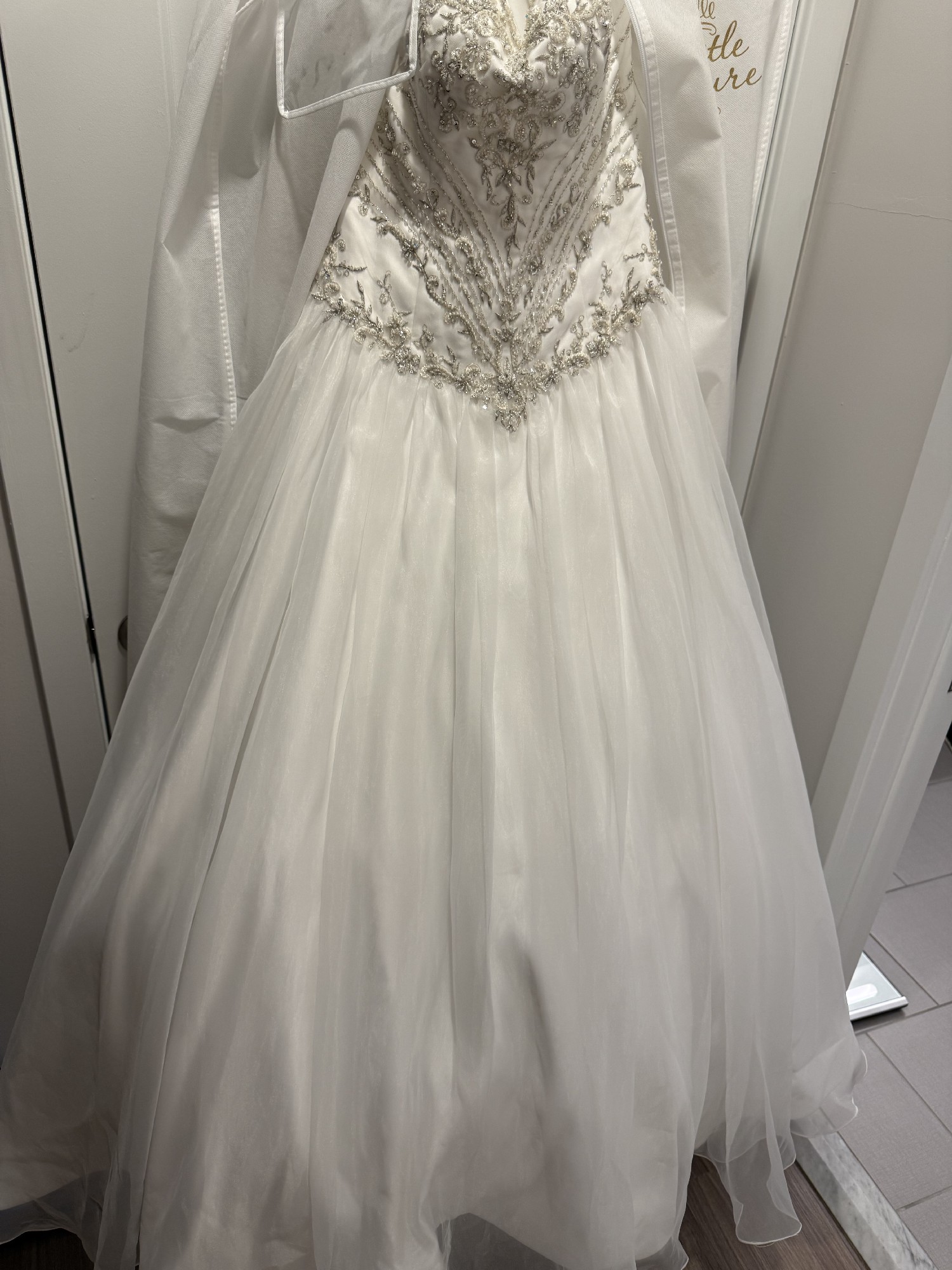 Fairytale ball gown of Chic organza, accented with dazzling Swarovski crystals and beaded embroidery ornamenting the bodice. Corset back closure cinches the waist. Bought from a sample sale but never wore her beyond trying it on! Would love to find her a new home :)