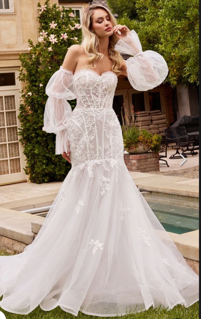 Crafted in radiant white fabric, this floor-length masterpiece showcases exquisite 3D flower details that create an enchanting, ethereal look. The versatility of the detachable puff sleeves allows you to customize your bridal look, offering a statement of elegance for the ceremony and ease for the reception. Whether you’re exchanging vows in a grand ballroom or an intimate garden, this dress promises to make your special day unforgettable. Embrace the magic of your wedding with this charming gown, designed for brides who desire to express their unique style and grace. Slip into the CD858W and let your fairy tale unfold.