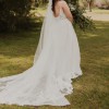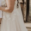 This Jenica dress is a wedding dress from Madi Lane Bridal. The dress is made from a combination of organic lace, tulle, and a silvery sequin underskirt. The sequins catch the light without being too glittery.