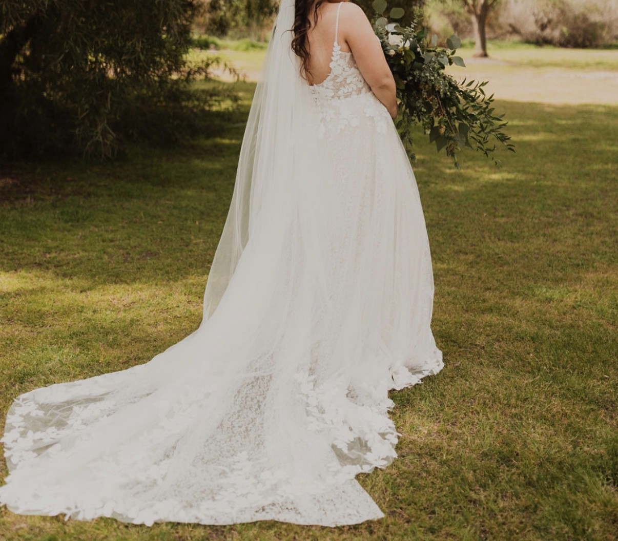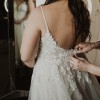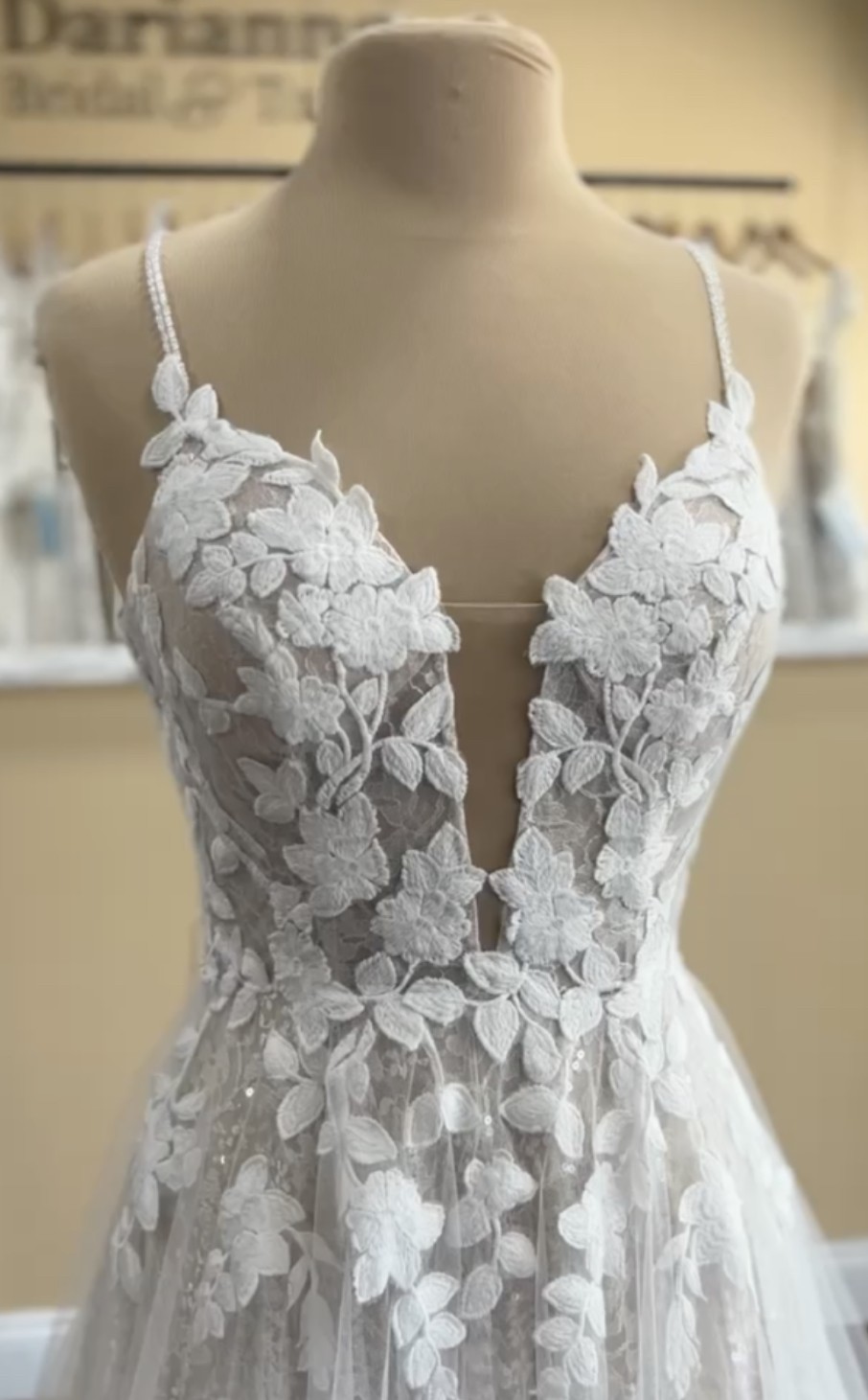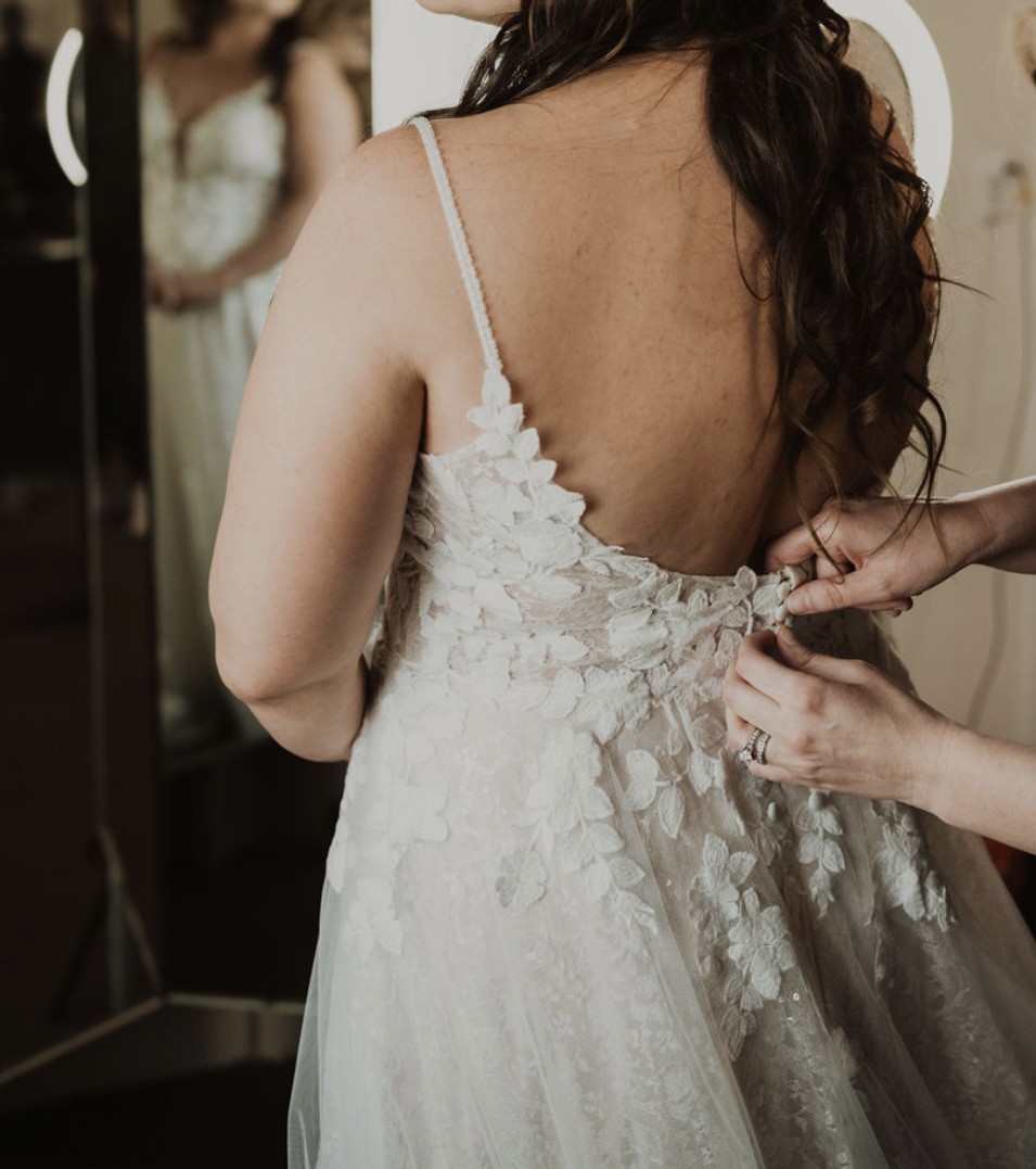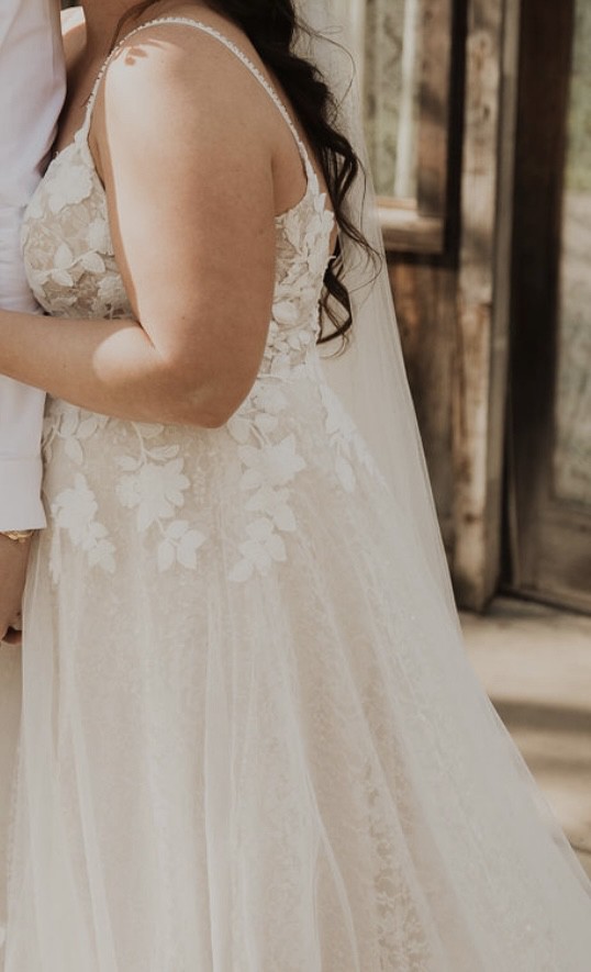 - Dress was brought in slightly at the top to better fit the bride’s cup size and to help the straps fit more snug