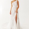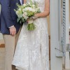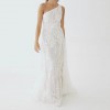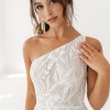 I loved the elegant but slim A-line silhouette which is so feminine but doesn't puff out at the waist the way some other A-Lines. I think its beautifully slimming and classic. The captivating one-shoulder neckline adds an element of modern chic and stands out beautifully in photos. The fabric is lace-like but has some subtle metallic sewn in. It's simply stunning in pictures. The designer describes this dress as goddess-style, red-carpet-worthy gown and that was very true.