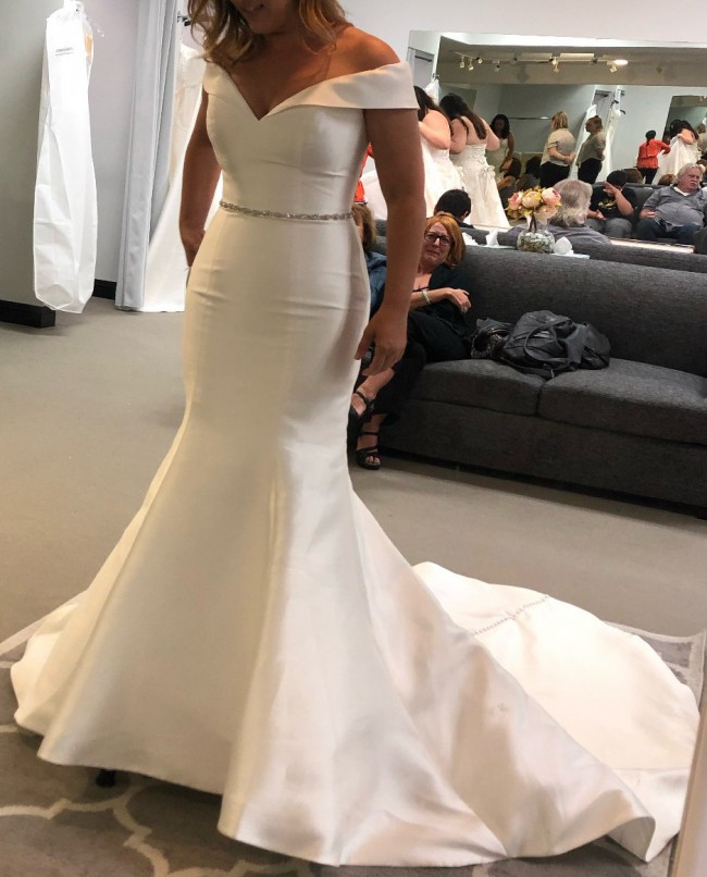 This stunning Rebecca Ingram wedding dress captures the essence of romance and elegance in every detail. The trumpet silhouette beautifully accentuates your curves, creating a timeless, statuesque look as you walk down the aisle. Off-the-shoulder neckline frames the décolletage in an enchanting way, adding a touch of allure while remaining sophisticated.