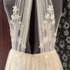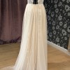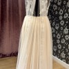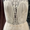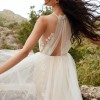 Geometric, botanical embellishment diffusing through diaphanous layers of tulle draped masterfully into an unexpected silhouette with a halter neckline and an open back. Skye is designed for an effortlessly chic, discerning bride longing to make a statement with her style. Color is nude.