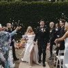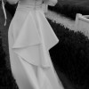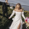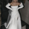 Crisp silk white, satin gown with dramatic leg split and detachable puff sleeves. The silhouette cleverly hugs the body with its tight fitting corset and flares out into an A-line shape.
