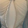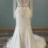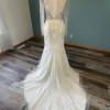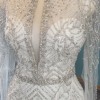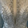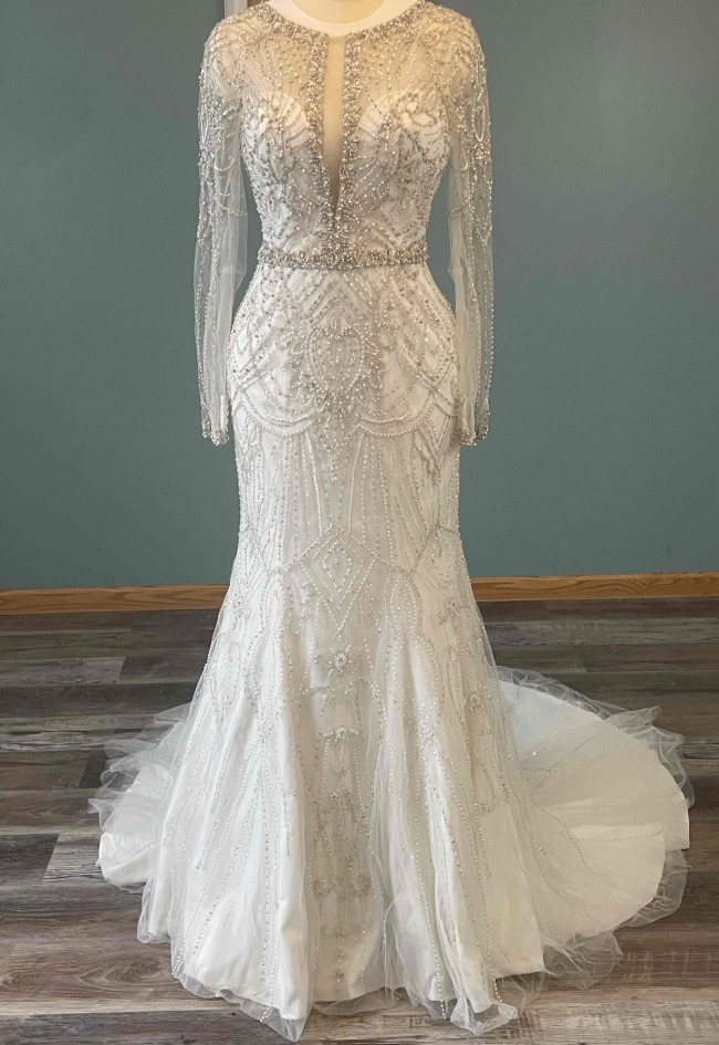 Your wedding day look will never be forgotten with this opulent beadwork that covers the sleeves, bodice and skirt of the gown. Lined with innovative stretch mesh. The hand beaded Sabrina neckline with plunging V-neck matches the illusion back adorned with beading and working button closures. This stunning dress complete with chapel trail is prefect for an elegant bride that wants to sparkle on her very special day. The video does not do justice to show how much the dress truly sparkles. Shipping within the continental US is $50.