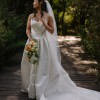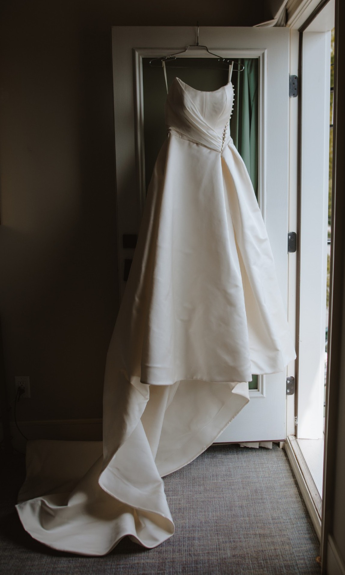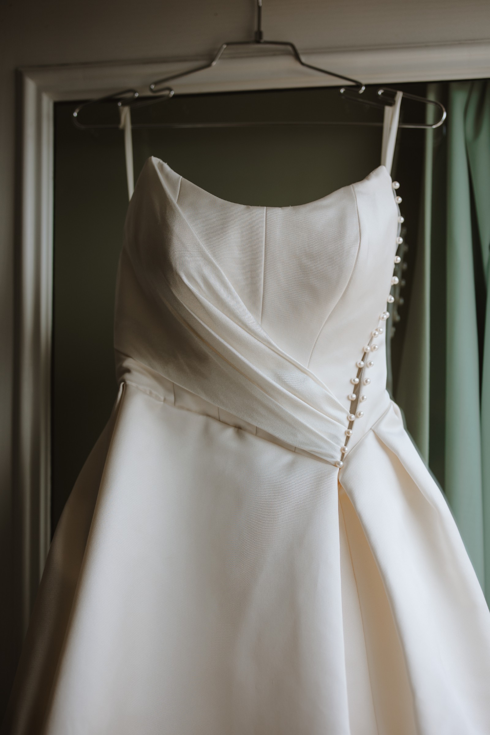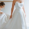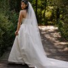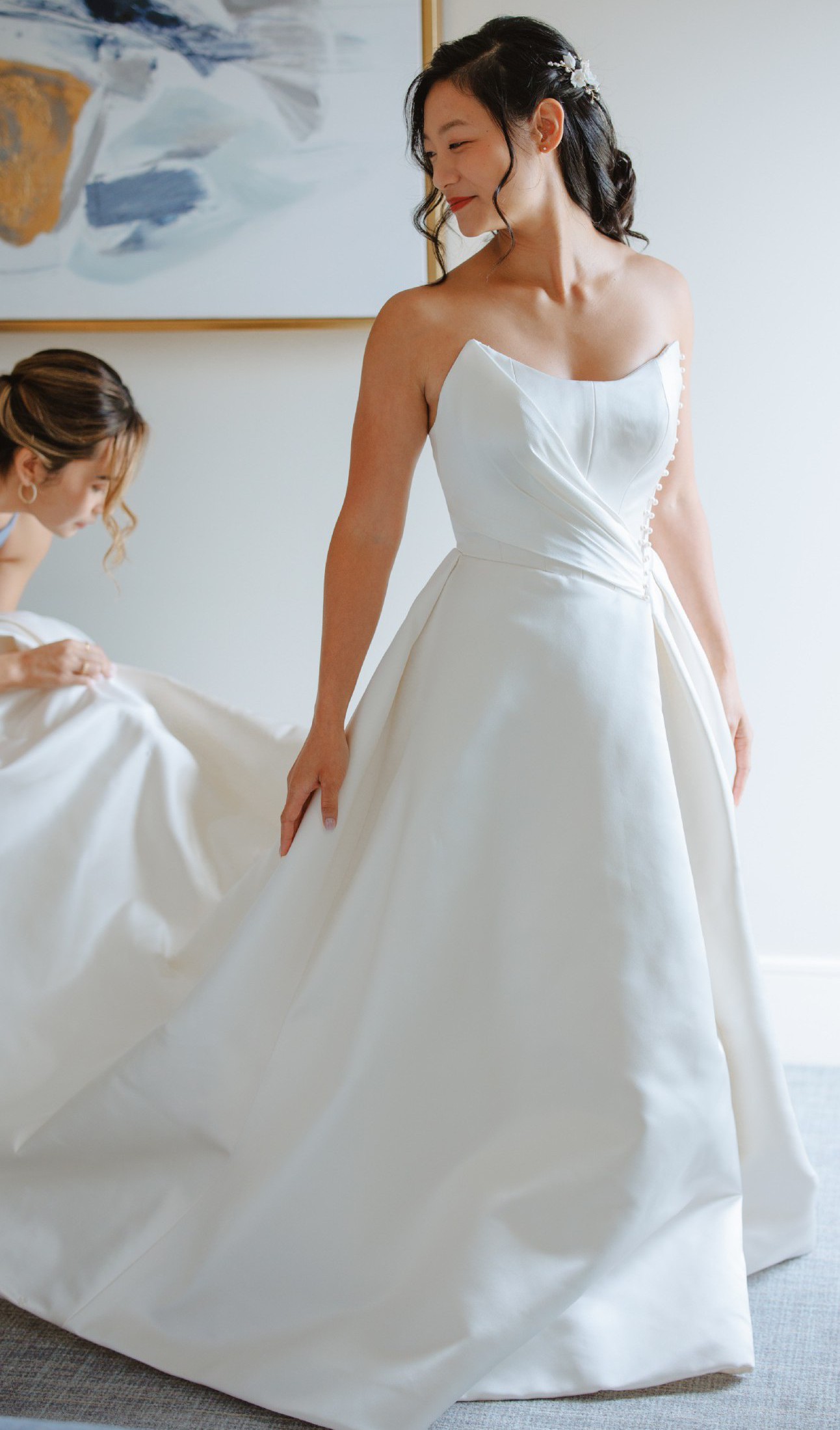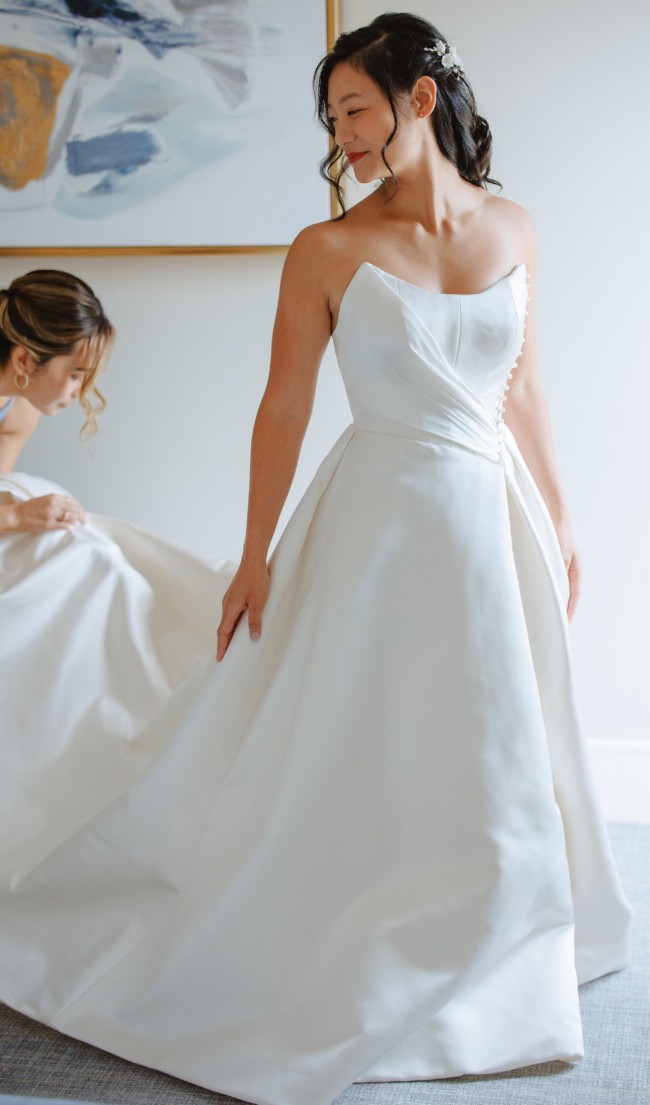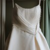 - Bustle - classic/American bustle that comes up to elegant pleats, with three hidden buttons along hem to keep skirt in place