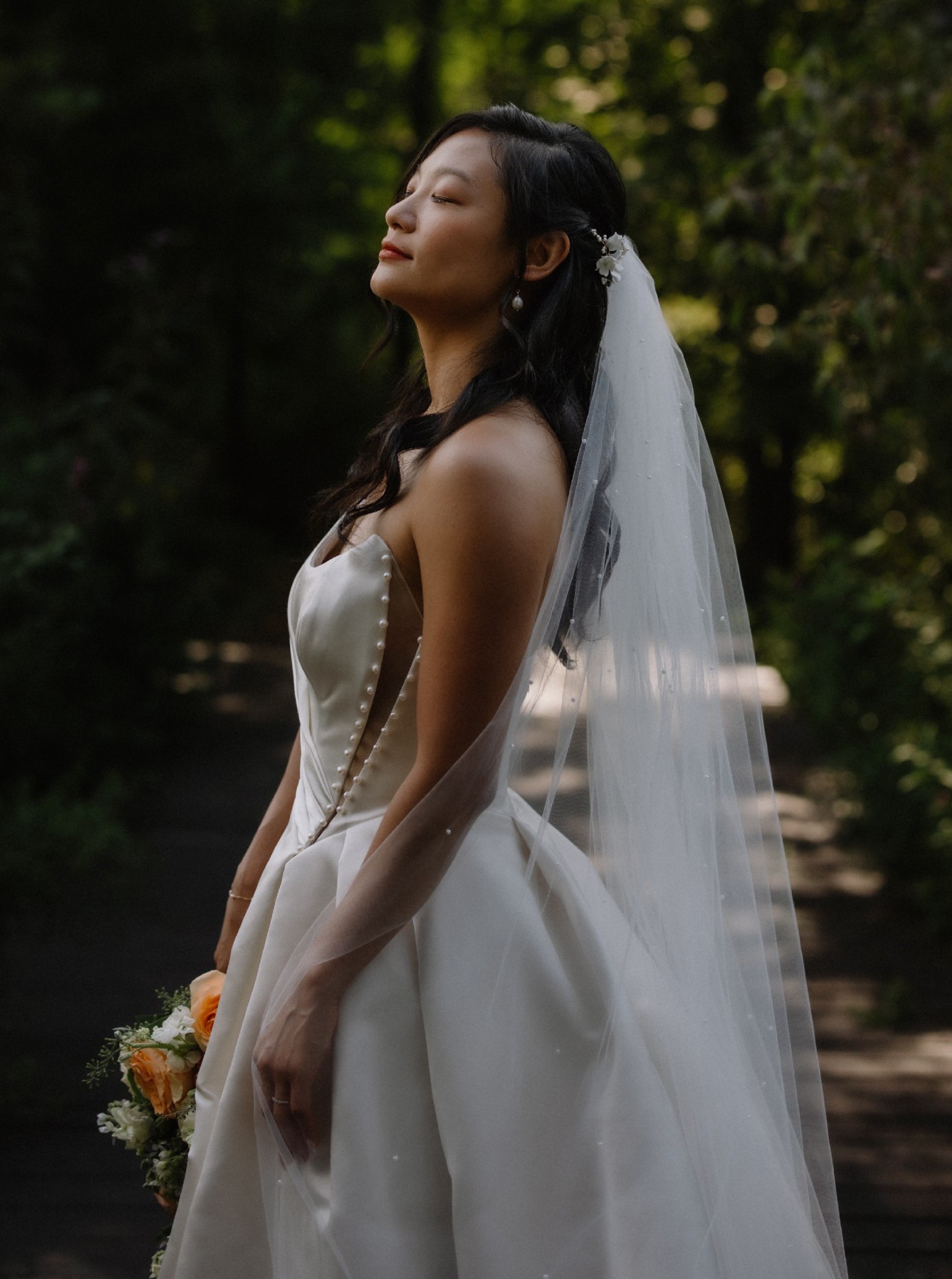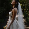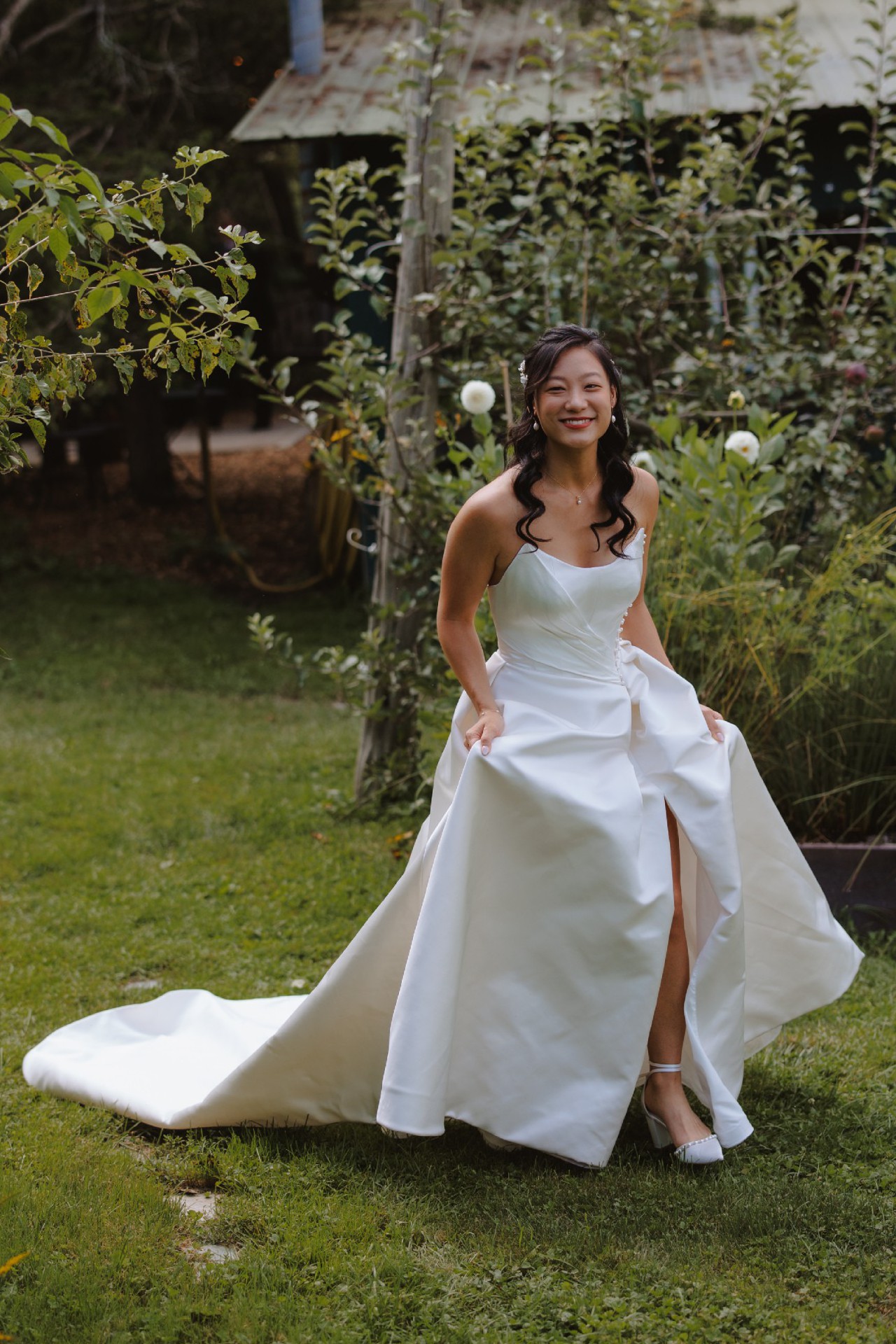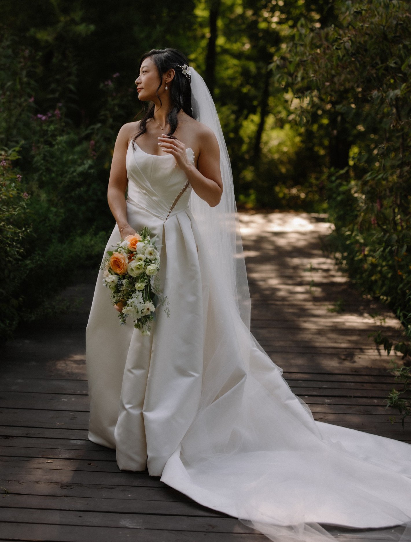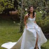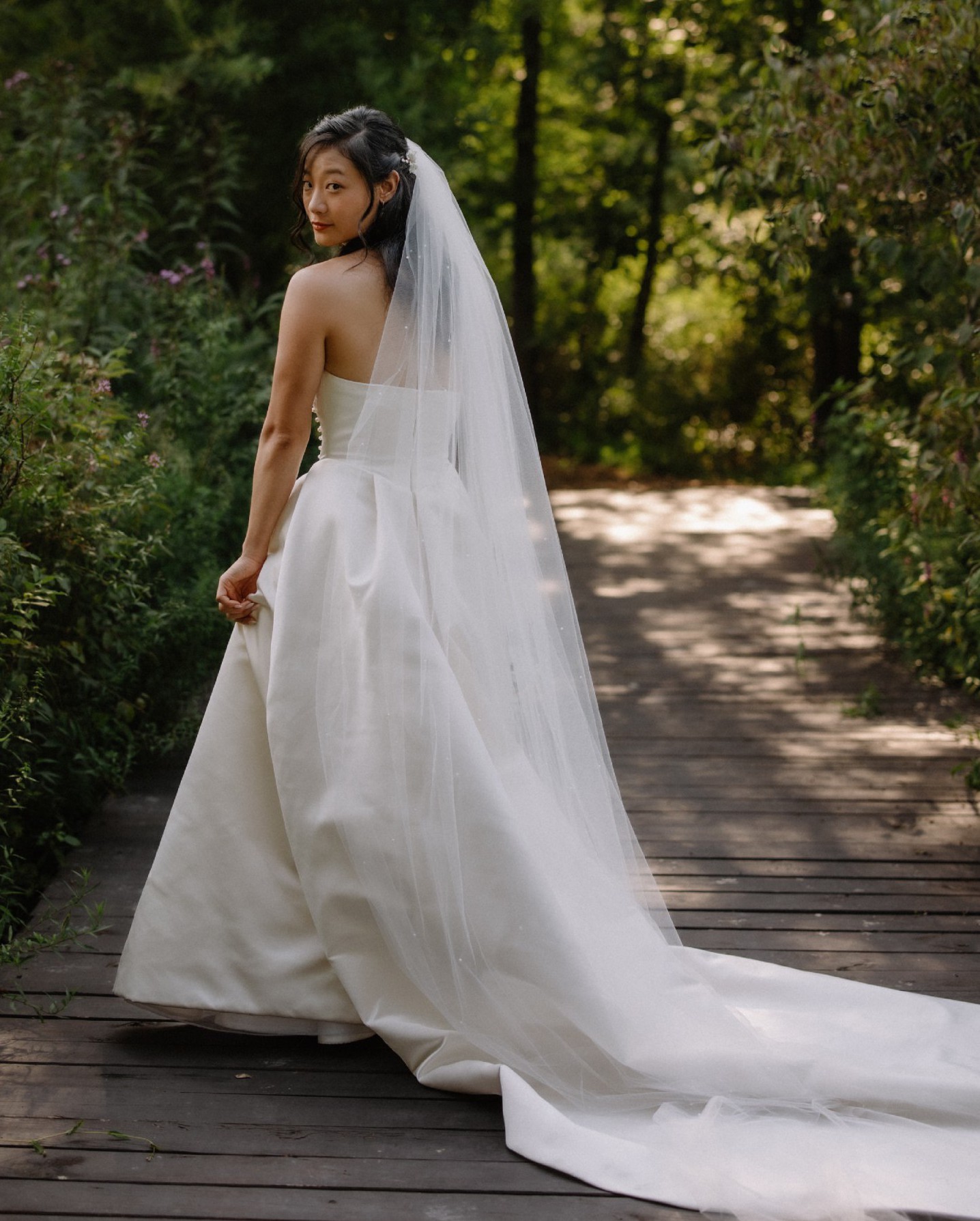 - Bustle - classic/American bustle that comes up to elegant pleats, with three hidden buttons along hem to keep skirt in place