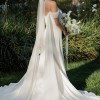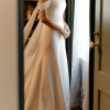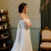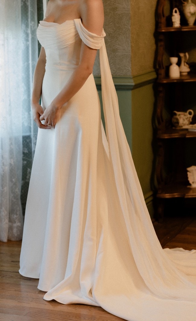 The Francesca gown is an effortless blend of clean lines and romantic details. The fit and flare silhouette, cut in our Italian crepe fabric, hugs and flatters every curve. Silk chiffon draped languidly across the shoulders and bodice adds a timelessly feminine feeling, and offers a versatile convertible sleeve. Streamers at the back add one last dramatic detail, and detach for ease of wear.