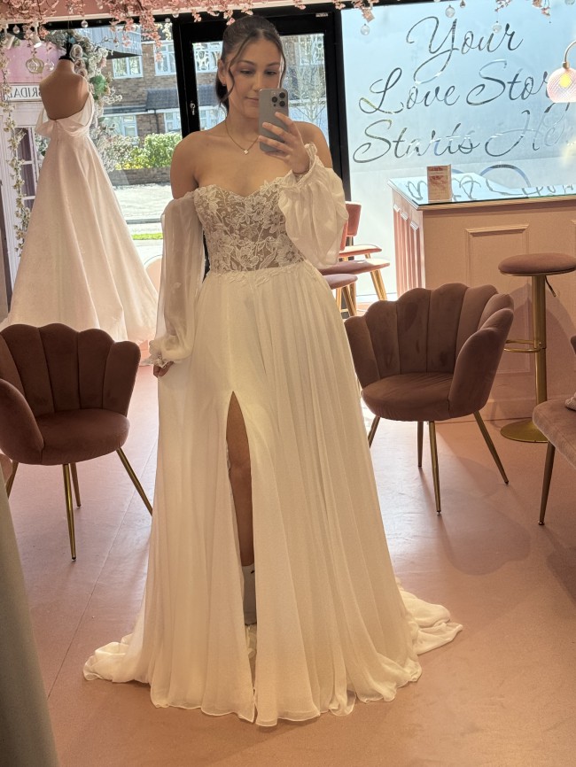 Created in a rich luxe chiffon, this A-line bridal dress was designed for a goddess. The illusion bodice is shaped with a sweetheart neckline, framed with airy off the shoulder blouson sleeves. Beaded embroidered chiffon appliqués accented by silver thread adorn the bodice and continue down to subtly detail the inside of the long sleeves. Covered buttons accent the illusion back bodice giving way to the flowing skirt complete with a walking slit.