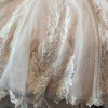 Fit-and-flare ivory over blush beaded open back bridal gown, with vintage styling and extended scalloped ivory illusion lace train: