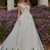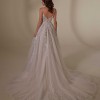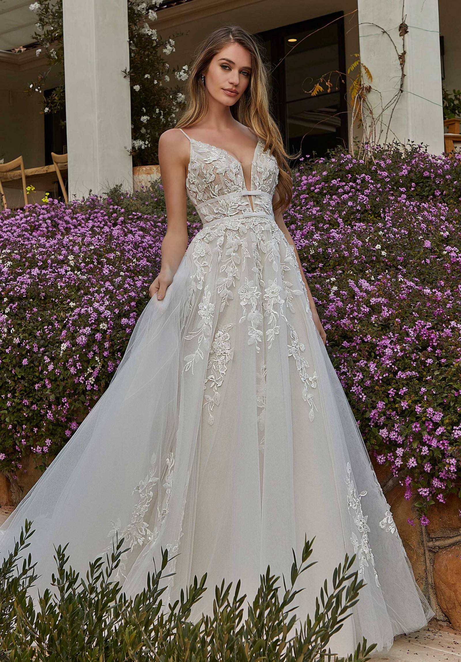 Our Matilda designer wedding dress is a billowing boho beauty with an A-line ball gown silhouette and botanical details. The plunging sweetheart bodice is given structure with boning, while a double banded waist with dainty bows define your figure. Crystal beaded, frosted floral embroidery floats down the airy tulle gown, finished off by a lovely laced-trimmed train.